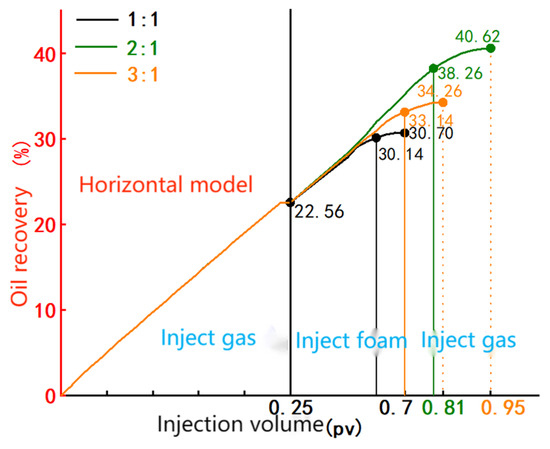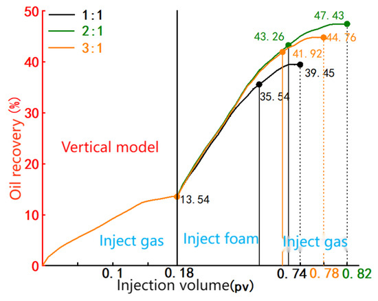 The experimental results indicate that a gas–liquid ratio of 2:1 provides the best foam displacement efficiency among the three tested ratios, making it the optimal choice.