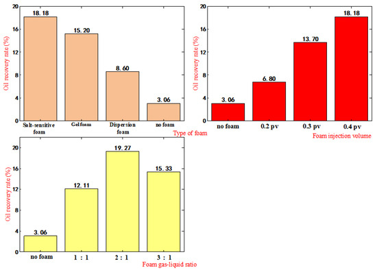 This study evaluated various foam types for foam-assisted gas displacement at an injection volume of 0.4 PV and a gas–liquid ratio of 2:1, following gas coning. The results are presented in Table 4 and Figure 11.