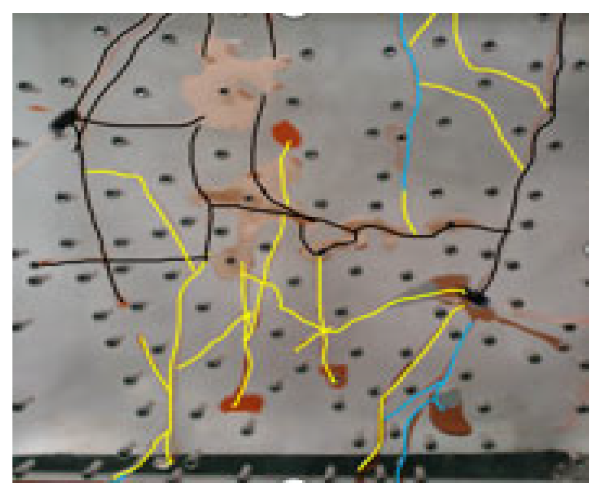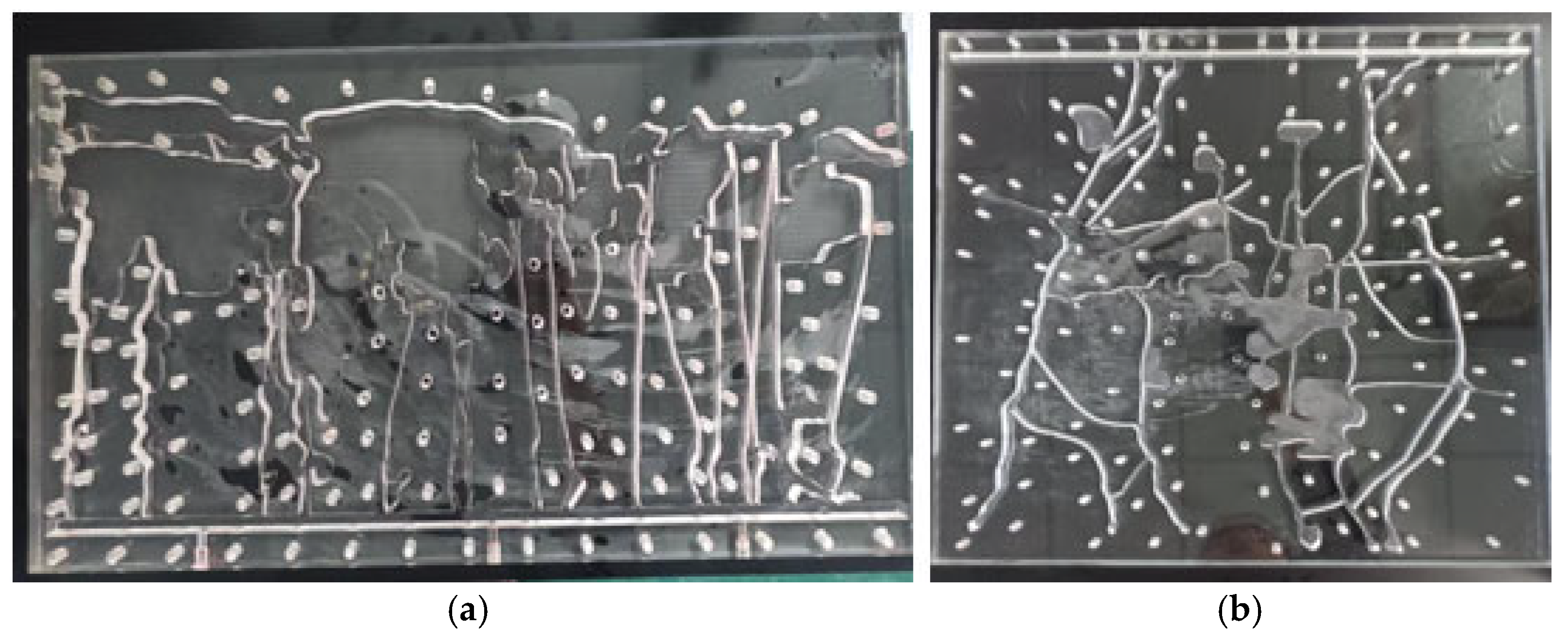 6] revealed that within a regular slit-hole network, gel foam adheres to and seals the openings, thereby guiding the upward migration of gas and enhancing the co-driving recovery of residual oil. In systems containing both fractures and irregular cavities, the foam—owing to its density and mobility—propagates downward and laterally along the fracture paths, facilitating the displacement of crude oil and formation water toward production wells. Youssif et al. [