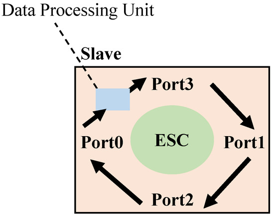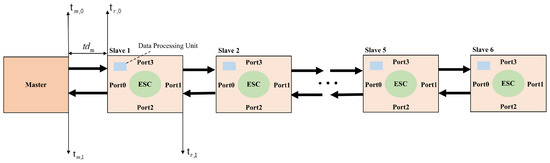 When calculating the transmission delay between slaves, the ESC chip in EtherCAT slave devices adheres to the “0-3-1-2” port sequence for network transmission [36], as illustrated in Figure 2. Furthermore, the chip records only the timestamp corresponding to the reception of a data frame at each port. Therefore, determining the transmission delay of a slave involves utilizing the port latch times and the specified port sequence.