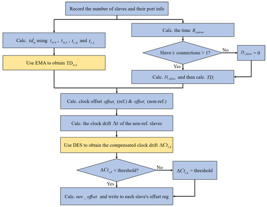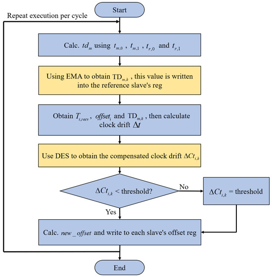 First, the master sends a data frame to obtain the number of slaves and port information, followed by determining the topology of the slaves. Using the port information, the master identifies the parent slave and the parent port for each slave. Next, the master records the time of sending and receiving data frames, along with the time when reference slave ports 0 and 1 receive the data frames. The transmission delay between the master and the reference slave is then calculated. This initial transmission delay is recorded in the reference slave’s register. When the EMA is applied for the first time, . Subsequently, the transmission delay of the slave is calculated based on the time for the data frame to leave the parent of the non-reference slave i and return to the parent port, the transmission time of the subsequent slaves, and the transmission delay of the parent slave. Then, the DES algorithm is applied to calculate the compensated clock drift , verify whether it falls below the threshold value (to prevent potential over-compensation), and derive the final compensation value. Finally, the new clock offset is computed by subtracting the compensation value from the clock offset . This new offset is then written to the slave to perform clock error compensation. The compensation function flowchart is shown in Figure 5. This function periodically uses the EMA and DES to compensate for the transmission delay and clock drift between the master and the reference slave, based on the configured cycle. This helps to reduce clock synchronization errors among the slaves and improve synchronization performance.