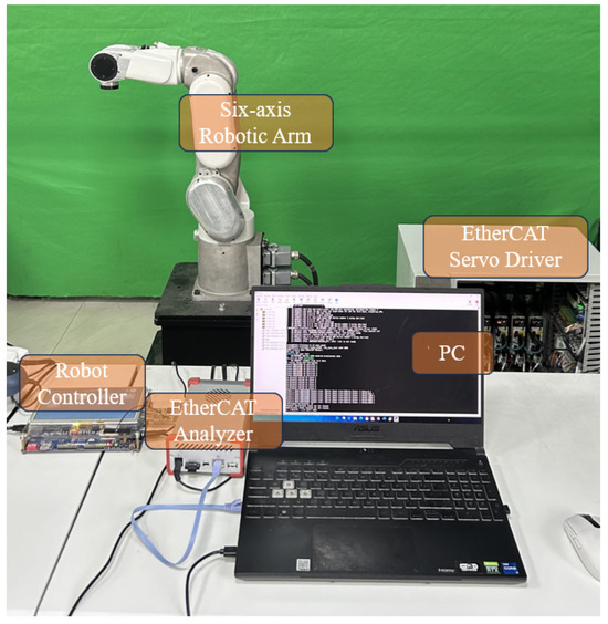 In terms of software, a dual-kernel setup using Linux 4.9.69 and Xenomai 3.0.11 is employed to ensure real-time performance [37]. The open-source master SOME is used as the EtherCAT master [38]. In terms of hardware, the system is based on the Siasun SR4C industrial robot platform. Each Panasonic MINAS A6N servo drive used in this experiment integrates an EtherCAT Slave Controller (ESC) module compliant with the EtherCAT standard. Therefore, these drives function as standard EtherCAT slave devices at the hardware level. Compared with using independent ESC chipset-based boards, employing industrial servo drives provides a more practical validation scenario, as it better reflects real-world applications in multi-axis robotic systems. The controller uses the TL437x-EasyEVM ARM board [39] from Tronlong as the master controller, featuring an AM4379 ARM Cortex-A9 processor. The slaves consist of six Panasonic MINAS A6N series servo drives. The PC communicates with the master controller via a serial port to issue commands and acquire data.
