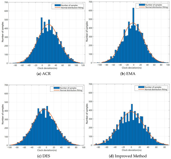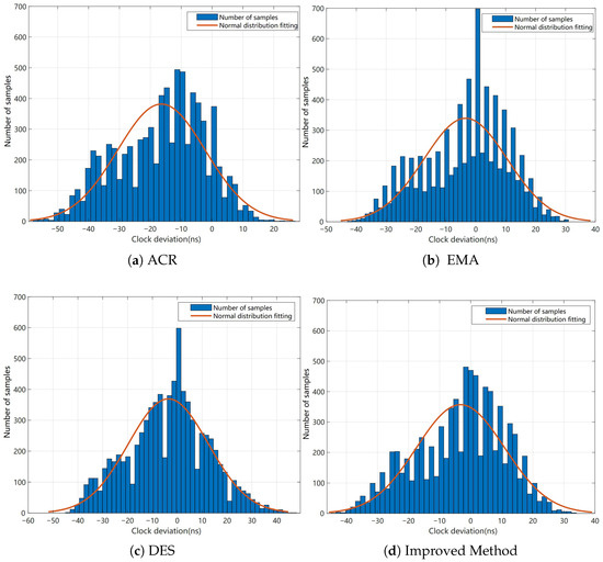 The clock rate adjustment method (ACR) controls the slave’s clock rate by determining the sign of the clock drift. When this method is used to control synchronization error, the resulting clock synchronization error histograms are shown in Figure 7a and Figure 8a.
