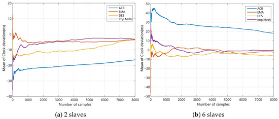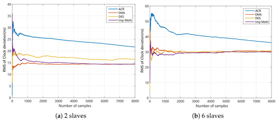 To validate the effectiveness of the proposed method, comparative experiments were conducted under identical hardware conditions using the open-source SOME master. Four synchronization methods were tested: clock rate adjustment (ACR), EMA, the proposed DES method, and the improved method. These experiments were conducted in environments with two slaves and six slaves, respectively.