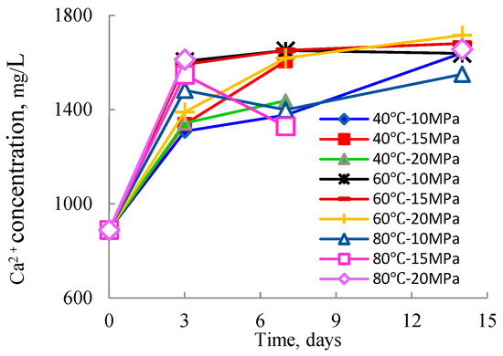 Since the dissolution reaction occurs in the liquid phase, the effect of pressure on the reaction is significantly less pronounced than that of temperature. Temperature variations notably influence the calcite dissolution process, as shown in Figure 2. Under 40 °C conditions, the concentration of Ca2+ is lower than at 60 °C and 80 °C, and the time to reach equilibrium is slower. At a low pressure of 10 MPa, the highest Ca2+ concentration and the fastest equilibrium are observed at 60 °C; whereas at a higher pressure of 20 MPa, the highest Ca2+ concentration and fastest equilibrium occur at 80 °C.