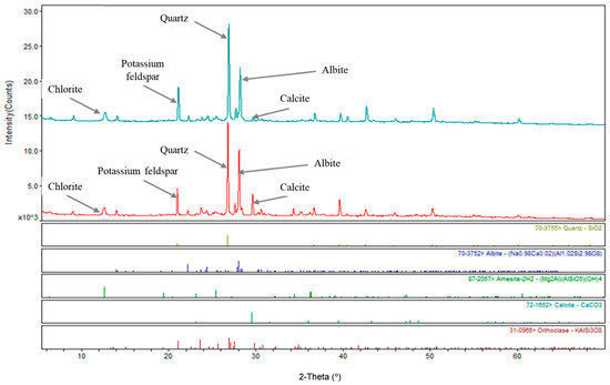 XRD tests were conducted on rock samples before and after the reaction. The results (see Figure 5) indicate that the overall mineral types did not change significantly. However, the dissolution of carbonate minerals such as calcite was quite pronounced after the reaction, with its characteristic diffraction peaks being almost completely eliminated, consistent with the previously discussed ICP data. In addition, compared to the pre-reaction samples, the quartz content showed a slight increase, and some transformation among feldspar minerals was observed. During the reaction, sodium feldspar underwent partial dissolution and was partly transformed into minor amounts of potassium feldspar, transitional feldspar minerals, and carbonate minerals. It is noteworthy that clay minerals such as chlorite exhibited no significant changes, with only minor variations in diffraction peak intensity.