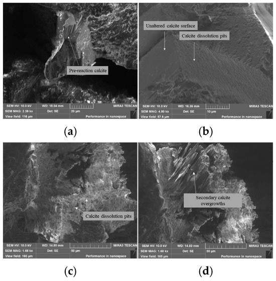 Surface morphology of calcite before and after reaction: (a) before reaction, (b) after reaction, (c) react at 40 °C and 10 MPa for 14 days, (d) react at 80 °C and 10 MPa for 14 days.