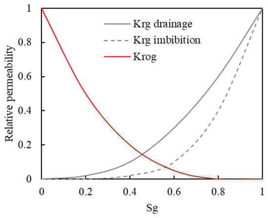 Based on field test results, the relative permeability curves for gas-phase displacement and imbibition need to be defined separately, as shown in Figure 8.