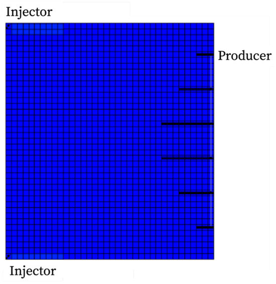 The model employs a configuration with two vertical wells for CO2 injection and a multistage fractured horizontal well for oil production, where the fractured horizontal well is simulated using a locally refined grid with a conductivity of 30 Dc·cm. The model dimensions are 520 × 820 × 10 m with a grid of 26 × 41 × 1 in Figure 9. A Warren–Root dual-porosity model is adopted, with the fracture system having a porosity of 0.2% and a permeability of 10 mD, and the matrix system having a porosity of 10% and a permeability of 0.05 mD. The initial oil saturation of the reservoir is 50%, with an initial pressure of 17 MPa and a temperature of 65 °C. The Peng–Robinson equation of state combined with a two-phase flash calculation method is used to determine oil–gas phase equilibrium in the model. During simulation, the CO2 injection rate is 5 t/d per well, with a water injection rate of 10 t/d during water–gas alternating injection. The oil displacement stage lasts for 10 years, followed by one year of continuous CO2 injection, with the total simulation period extending to 500 years.