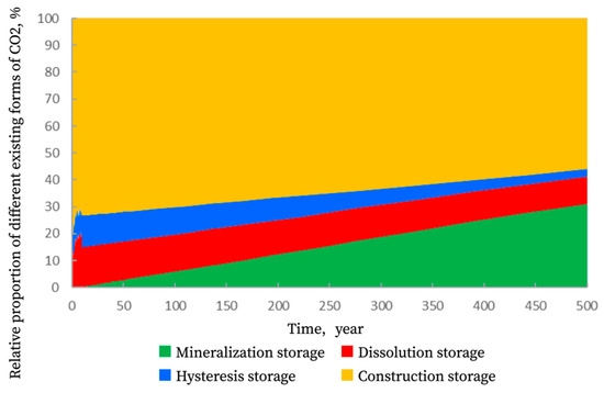Building on the earlier analysis of mineralogical changes and their impact on oil recovery, the long-term effects of CO2–water–rock reactions on the storage state of CO2 were further examined. It is generally accepted that after CO2 is injected into a reservoir, it exists mainly in four forms: free gas (structural trapping), residual gas (capillary trapping), dissolved gas (solubility trapping), and mineralized products from water–rock reactions (mineral trapping) [23,24]. Krevor [25] and Cui [26], among others, have conducted in-depth studies on this topic. In this work, we focus on the time dependence of different CO2 trapping mechanisms in the Jiyuan tight oil reservoir. Figure 12 shows the temporal variation in storage states for scenario 4. During the oil recovery stage, the order of storage capacity from largest to smallest is structural, solubility, residual, and mineral trapping, with proportions of 69.73%, 20.81%, 8.92%, and 0.53%, respectively. As water–rock reactions proceed, free and residual CO2 gradually convert into mineral forms stored within the reservoir [27]. After 500 years, the order of storage capacity changes to structural, mineral, solubility, and residual trapping, with proportions of 55.91%, 31.08%, 10.12%, and 2.89%, respectively. This indicates that about 15% of the free CO2 and 6% of the residual CO2 are transformed into mineralized CO2, contributing to the permanent and secure storage of CO2. It is crucial to highlight that this substantial long-term increase in mineral trapping is primarily governed by the slower kinetics of silicate mineral reactions. While initial calcite dissolution facilitates the process by altering the brine chemistry, the sustained dissolution of feldspar and subsequent precipitation of secondary carbonate and clay minerals are the dominant mechanisms for permanent CO2 sequestration over multi-century timescales.