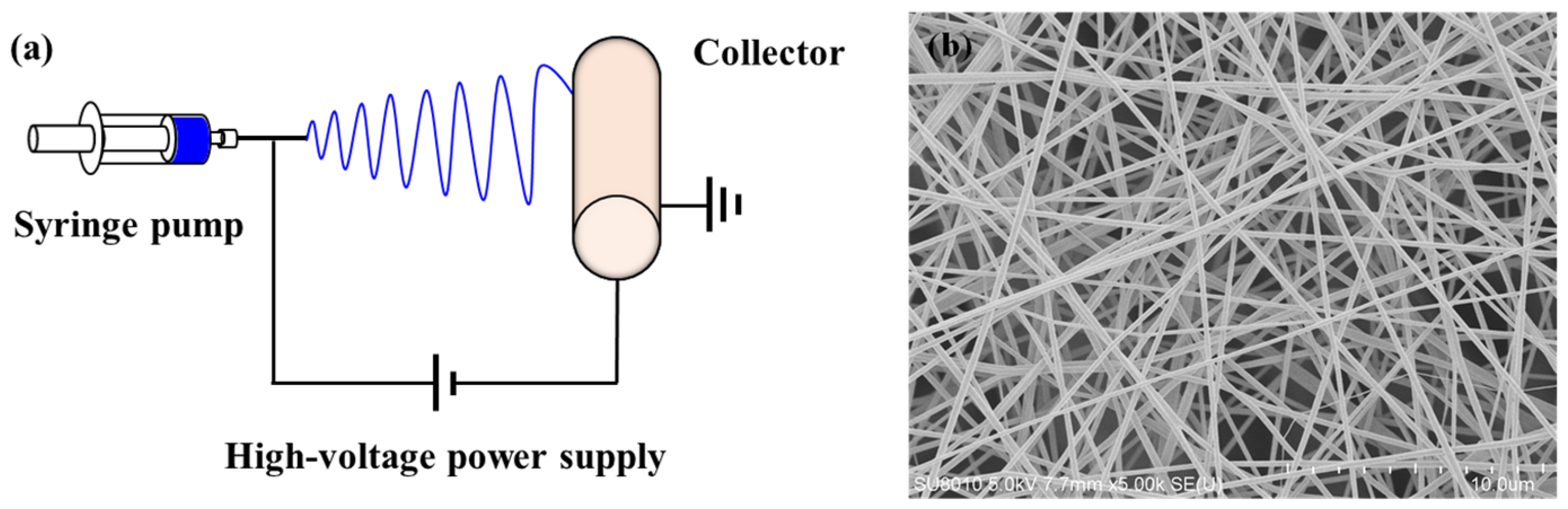(a) Illustration of electrospinning procedure; (b) SEM image of nanofibers.