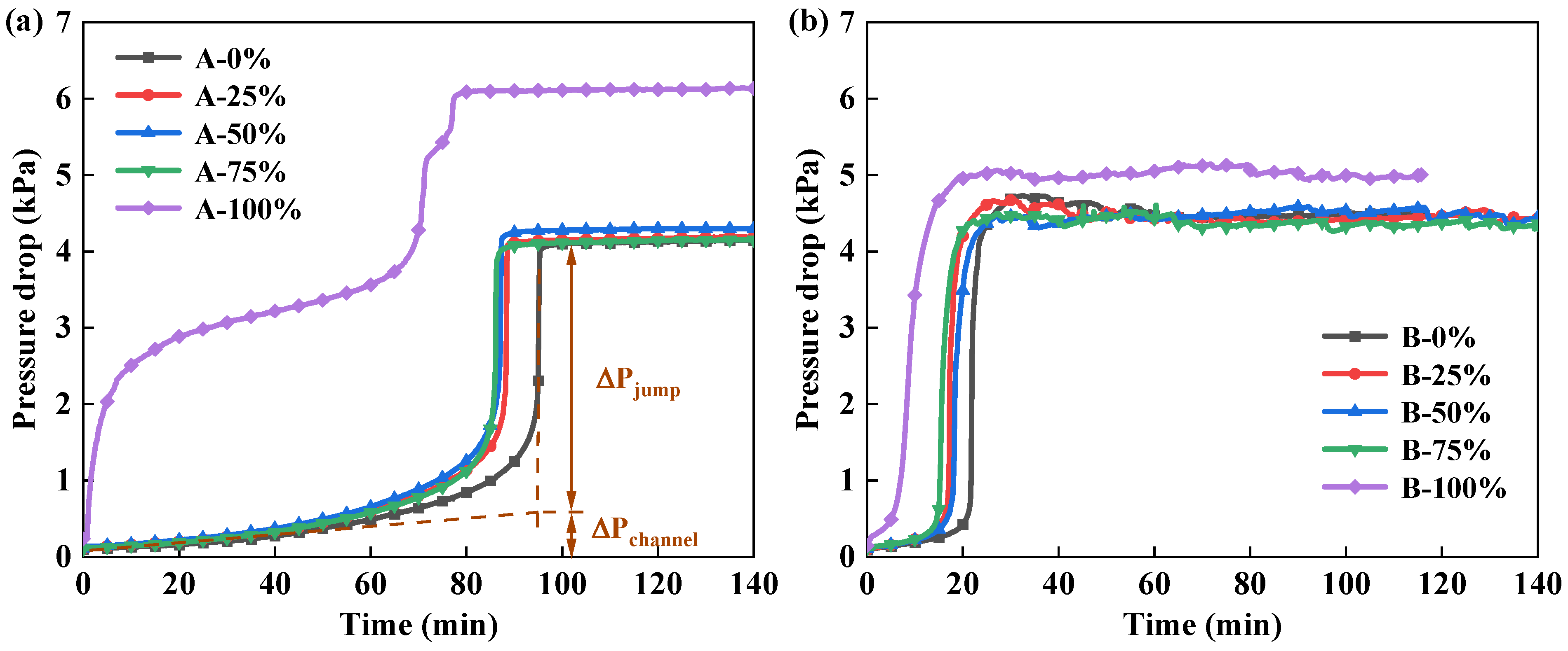 Figure 4 shows the evolution of pressure drop of Filter A and Filter B with different EARs. It can be seen from Figure 4a that the pressure drop curves show typical characteristic of oleophilic filters when the EAR is 0~75% according to the Jump-and-Channel model [19,20], in which the pressure drop first increases slowly (ΔPchannel), then rises sharply (ΔPjump) and finally remains stable. Accordingly, the evolution of pressure drop can be divided into the channel stage, jump stage, and steady stage. It was found that the pressure drop curves of Filter A-25%, A-50%, and A-75% were almost overlapped and in the same fashion as that of the Filter A-0%, implying that the electrospinning area had little influence on the pressure drop. However, the time for reaching the jump stage was reduced for the filters with nanofiber membranes, meaning that the time for the liquid to transport from the front side of the filter to the rear side is shortened. In fact, there is a liquid film forming on the surface of nanofiber membrane, leading to an increase in resistance for the movement of the liquid, because of which, however, the aerosols preferentially flow into the non-electrospinning area. In this case, both the gas flowrate and liquid loading rate in the non-electrospinning area increase within the same time, resulting in an acceleration for the liquid transportation in the filters. The above analysis is further confirmed by the result in the following study, which is the longer electrospinning time leads to the less time for the liquid transports in the non-electrospinning area. As the EAR is 100%, the pressure drop increased significantly at the beginning of the experiment. The prepared nanofiber membrane in this paper are oleophilic. Liquid droplets entrained by the air were intercepted by the nanofiber membrane as it flowed in the filter, resulting in the formation of a liquid film on the surface. As all the surface of filter medium was covered by the membrane, most pores were clogged in the front face of filter, leading to a remarkable increase in the flow resistance. Moreover, the time for the channel stage is further shortened, compared with other filters.