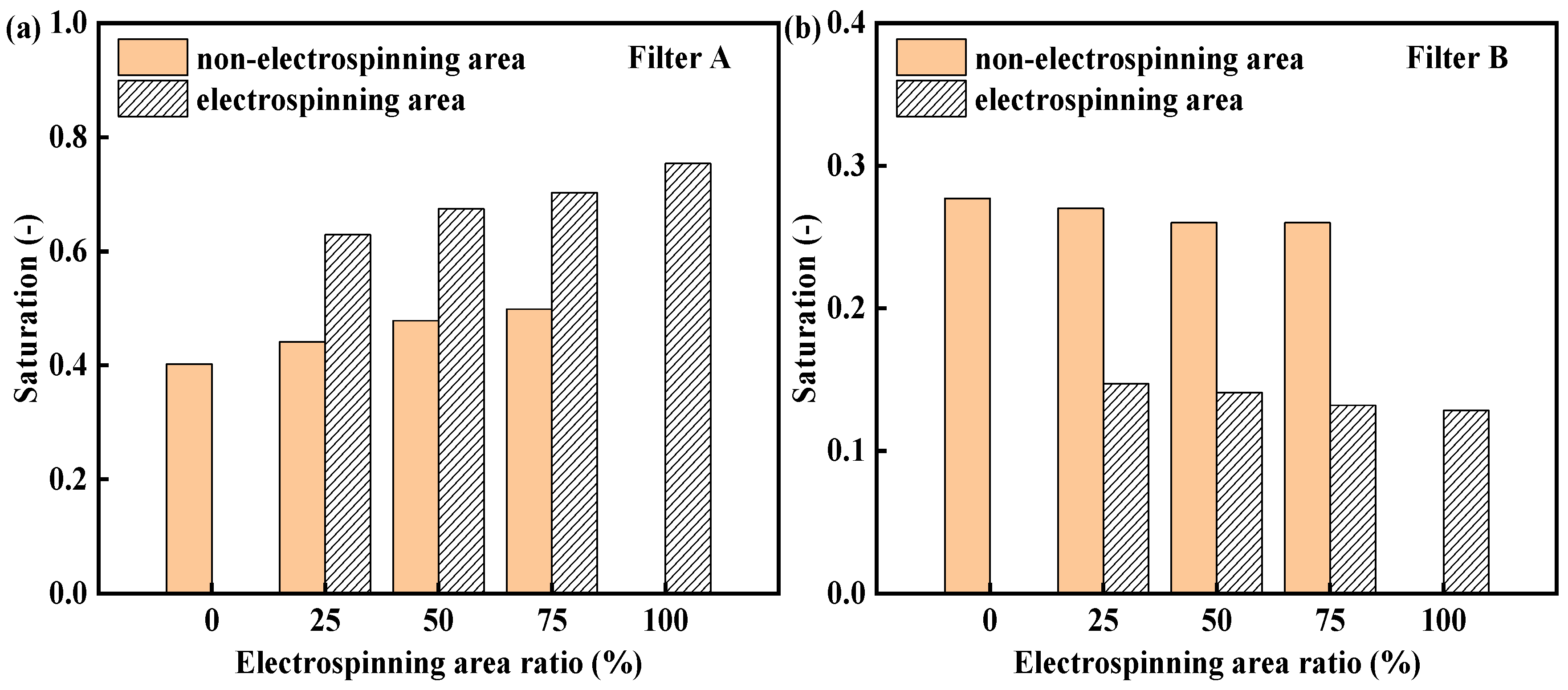 Saturation of different electrospinning area ratios: (a) Filter A; (b) Filter B.