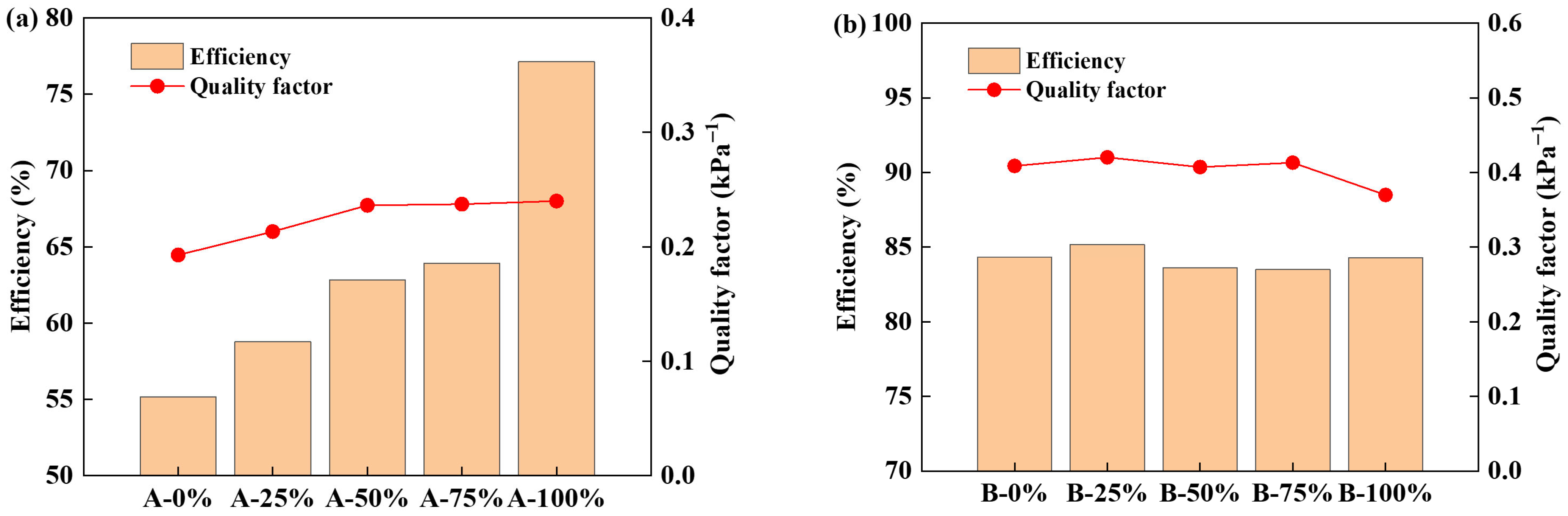 Filtration efficiency and quality factor of dual-layer (a) Filter A and (b) Filter B with different combinations.