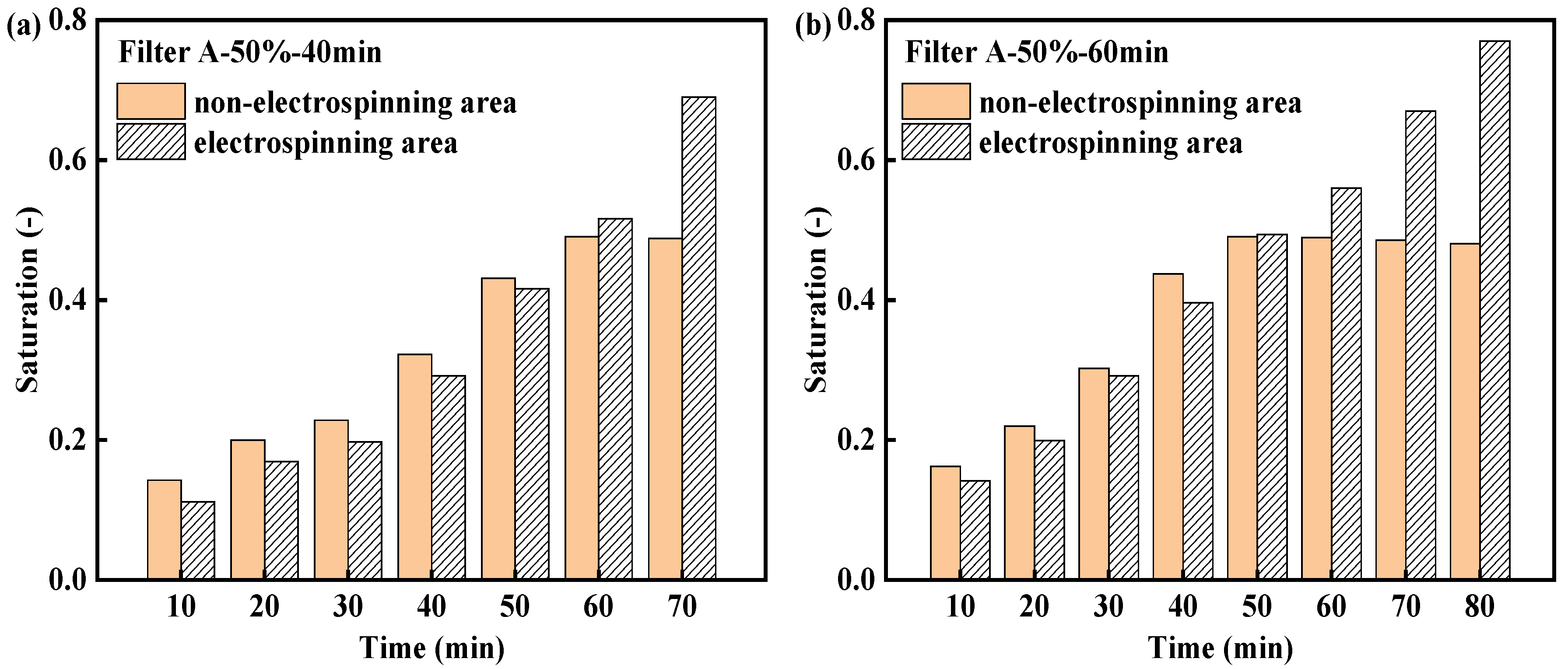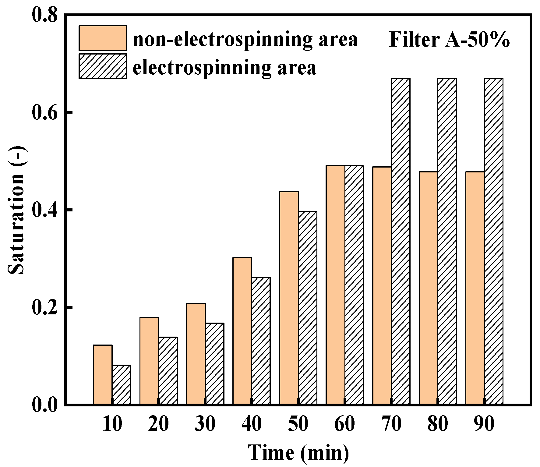 Figure 7 shows the saturation of the non-electrospinning area and electrospinning area in Filter A-50% at 10 to 90 min under the same conditions. As can be seen, the saturation of the electrospinning area is close to but always slightly lower than that of the non-electrospinning area at the channel stage (0–50 min). It is reasonable to speculate that the flow resistance for liquid in the electrospinning area is higher than that in the non-electrospinning area at this stage. For the electrospinning area, the nanofibers are relatively dense and with smaller pore size than the substrate, where it is easier to form liquid film after capturing liquid than in the non-electrospinning area, resulting in increased transportation resistance for liquid into the filter.