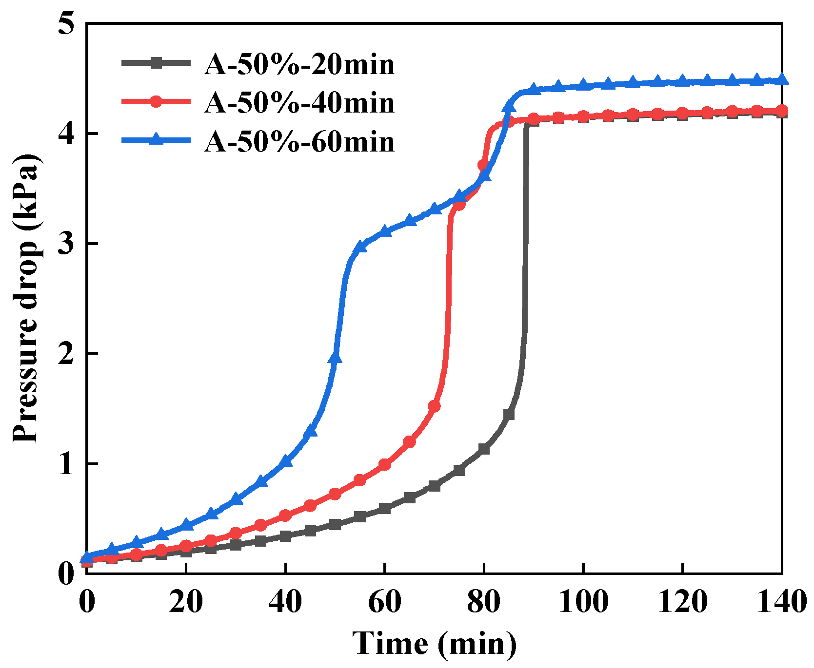Further, under the conditions of electrospinning time of 40 min and 60 min, the filters with EAR of 50% were prepared. Figure 10 shows the pressure drop of the filters with different electrospinning time. With the increase in electrospinning time, the time for the filters experiencing the channel stage is shorter. Obviously, more electrospinning time attributes the denser nanofibers, resulting in higher airflow resistance as liquid film is formed in the electrospinning area. Aerosols preferentially flow in the non-electrospinning area, which increases the filtration velocity in this region and correspondingly increases the liquid transportation velocity after being captured by the fibers. Therefore, the longer electrospinning time leads to less time for the liquid transports in the non-electrospinning area. On the other hand, for the Filter A-50%-40 min and A-50%-60 min, after the first jump in pressure drop, the “channel and jump” feature is again presented, which is caused by the liquid flow in the electrospinning area.