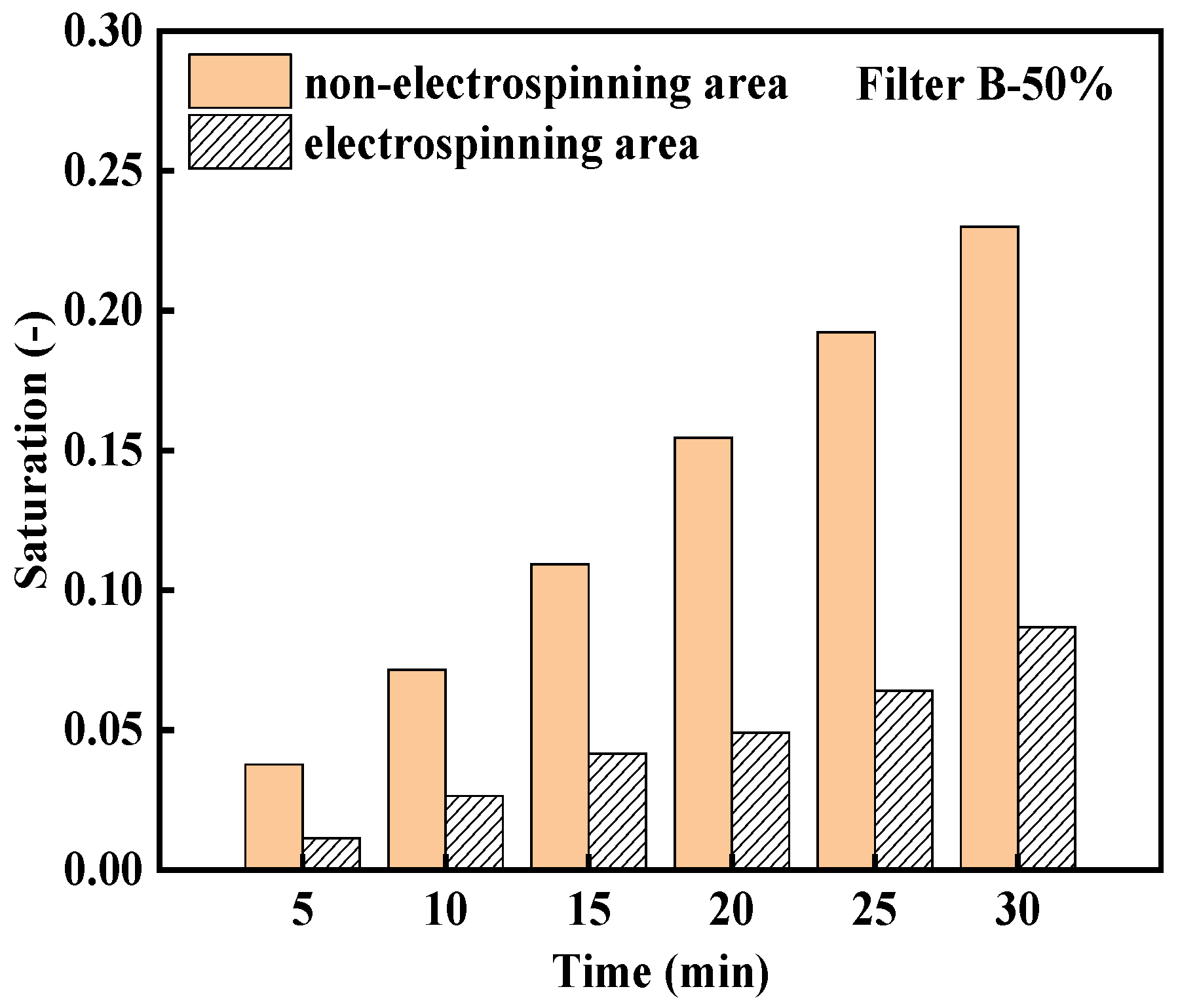 Figure 12 shows the saturation of the non-electrospinning area and electrospinning area in Filter B-50% at 5 to 30 min under the same conditions. The saturation of the electrospinning area is always lower than that of the non-electrospinning area, between which the difference gradually increases, indicating that the flow resistance for liquid in the electrospinning area is higher than that in the non-electrospinning area during the whole filtration process.