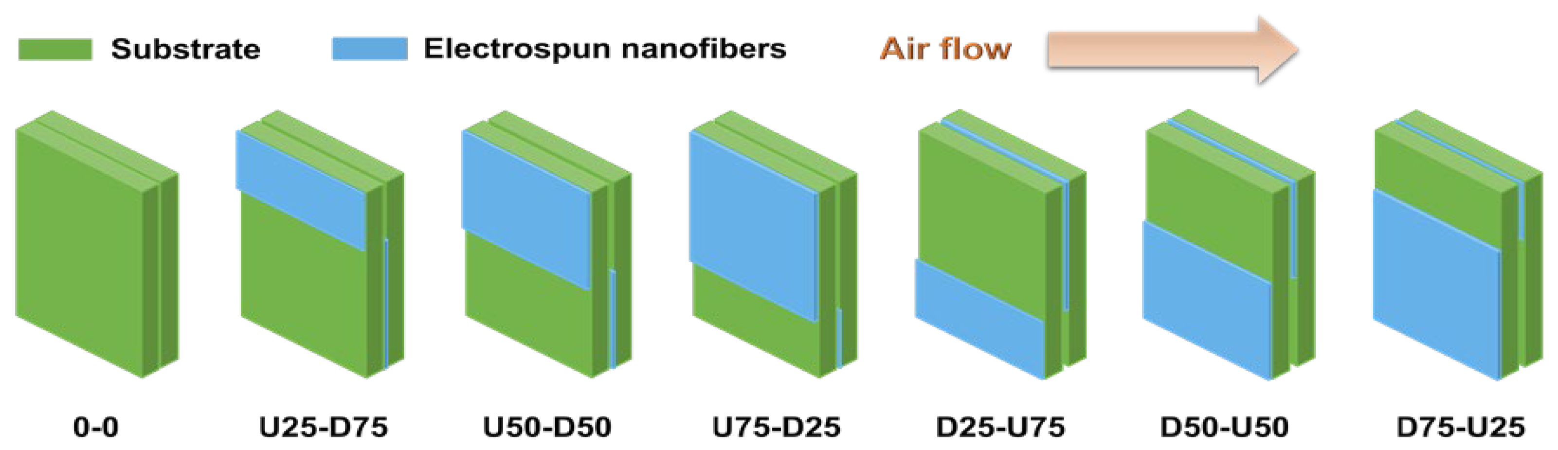 The different regions of the filter medium were covered by a nanofiber membrane to investigate the filtration performance of the different combinations of dual-layer filter media, as shown in Figure 16. The electrospinning area in the double layer is staggered. The total electrospinning area of two layers is equal to the area of the single layer filter medium, so that the air can flow uniformly through the medium at the initial experimental stage. The green section represents the substrate. The blue section represents the electrospinning area (nanofibers membrane). The filters are named after the type of filter medium, the location of electrospinning area and the EAR on the front and back layers. For example, Filter A-U25-D75 indicates that the substrate is filter medium A, and the nanofiber membrane on the first filter medium is at the up region with the EAR of 25%, while the nanofiber membrane on the second filter medium is at the down region with the EAR of 75%. The substrate without a nanofiber membrane was used as the control for comparison and named as Filter A/B-0-0.