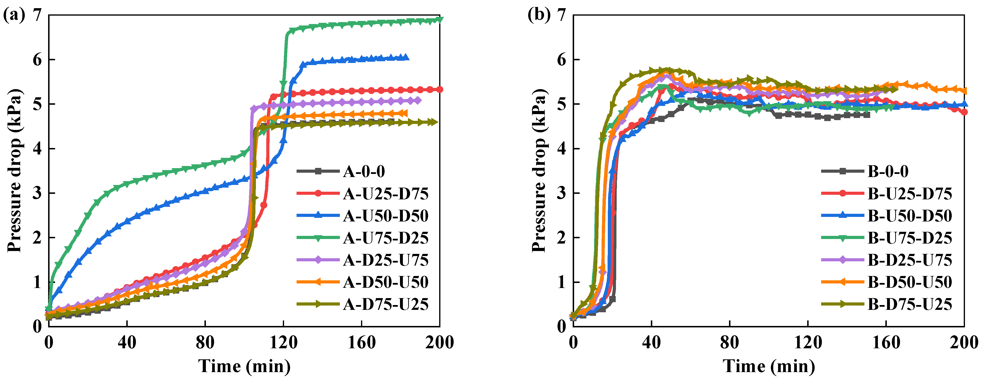 Figure 17 shows the evolution of the pressure drop curve of dual-layer filters. For Filter A-0-0, Filter A-D25-U75, Filter A-D50-U50, and Filter A-D75-U25, the fashion of the pressure drop is almost the same and the steady-state pressure drop is similar, which is in the range of 4.6~5.1 kPa, implying that the nanofiber membrane located at the down region of the first layer does not change the liquid transportation and distribution in the filter. Interestingly, as the nanofiber membrane located the up region of the first layer, the pressure drop is significantly changed, for which the steady pressure drop increases with the increase in the EAR. The steady-state pressure drop of Filter A-U75-D25 is 48% higher than that of the control. The pressure drop curves of Filter A-U50-D50 and Filter A-U75-D25 are different from that of other combinations, but similar to that of Filter A-100% in Figure 4a, which indicates that a large surface area liquid film appears in the first layer. The nanofiber membrane at the up region captures liquid droplets and liquid film is formed. On the one hand, the liquid captured by the liquid film transports inside the filter with the air flow. On the other hand, a part of the captured liquid could flow to the non-electrospinning area at the down region of the filter medium by gravity. As a result, most of the surface areas of the front side of the filter are covered by the liquid film, resulting in a rapid rise in the pressure drop. However, when the nanofiber membrane is at the down region, the upper non-electrospinning area is not affected by liquid film. As can be seen from Figure 17b, the steady-state pressure drop of all combinations for dual-layer Filter B is relatively similar, ranging from 4.8 to 5.4 kPa. No matter where the nanofiber membrane is in the first layer, as the wettability of the nanofibers is opposite to that of the substrate, the jumps in pressure drop occur for all combinations at the initial stage, resulting in no great variation in the pressure drop for oleophobic filters with nanofiber membrane.