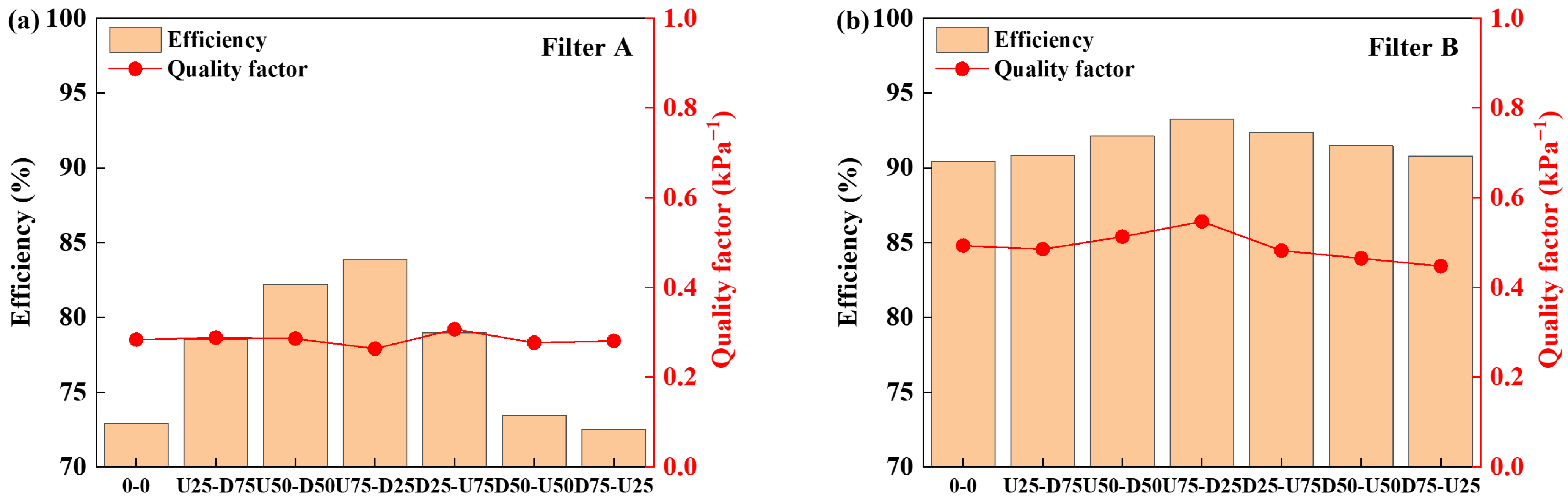 In terms of quality factor, the quality factor of different combinations of Filter A is almost maintained at 0.28, which only slightly decreases for Filter A-U75-D25 due to the great high steady-state pressure drop. For different combinations of Filter B, there is no obvious difference in steady-state pressure drop. The trend of quality factor is the same as that of filtration efficiency. Filter B-U75-D25 has the highest quality factor, which is 11% higher than Filter B-0-0.