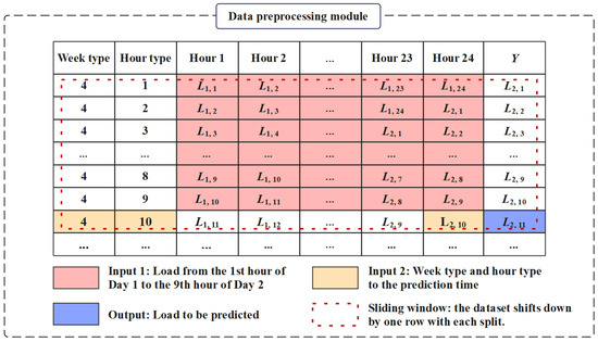 - 33 h loads before hour t: The loads from the 33 h preceding the forecast hour t serve as the first part of the input. A sliding partition method is applied: each row of load data covers a continuous 24 h span. For example, the first row contains 24 load values from 00:00 to 24:00 on 1 January; the second row contains 24 values from 01:00 on 1 January to 01:00 on 2 January, and so forth. The first 10 rows constructed in this way are used as the first input for prediction model.