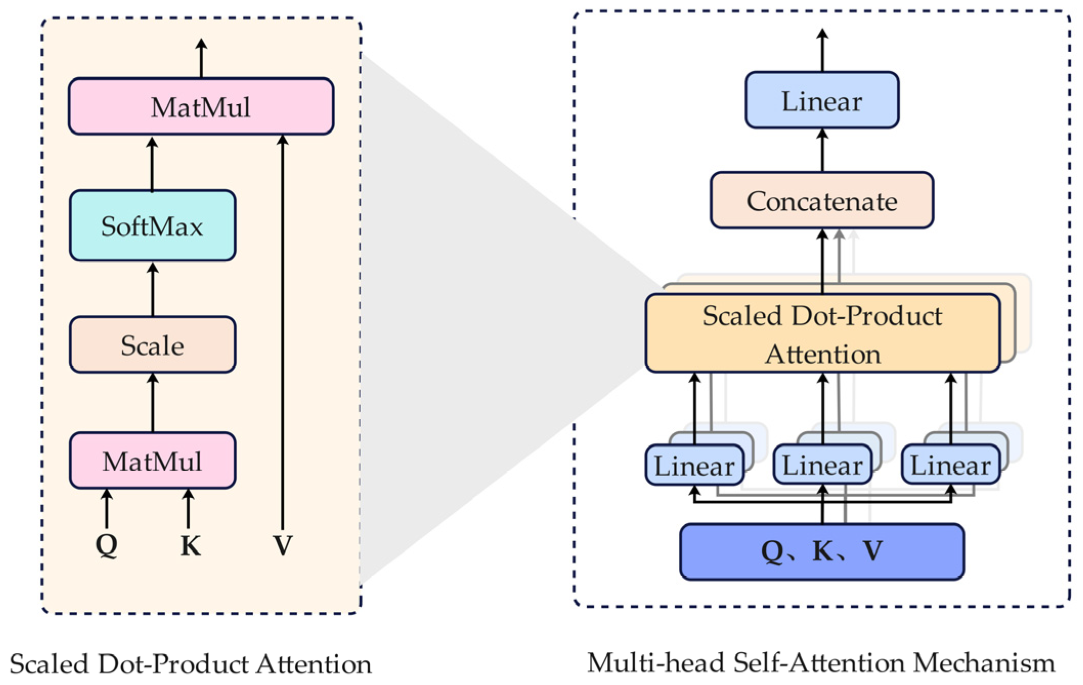 - Key information extraction: The features extracted by GRU encoder are concatenated with temporal information from the preprocessing stage and the load from the previous hour. This concatenated feature is then passed into the MHSAM. This mechanism is used to adaptively learn internal relationships within the input.