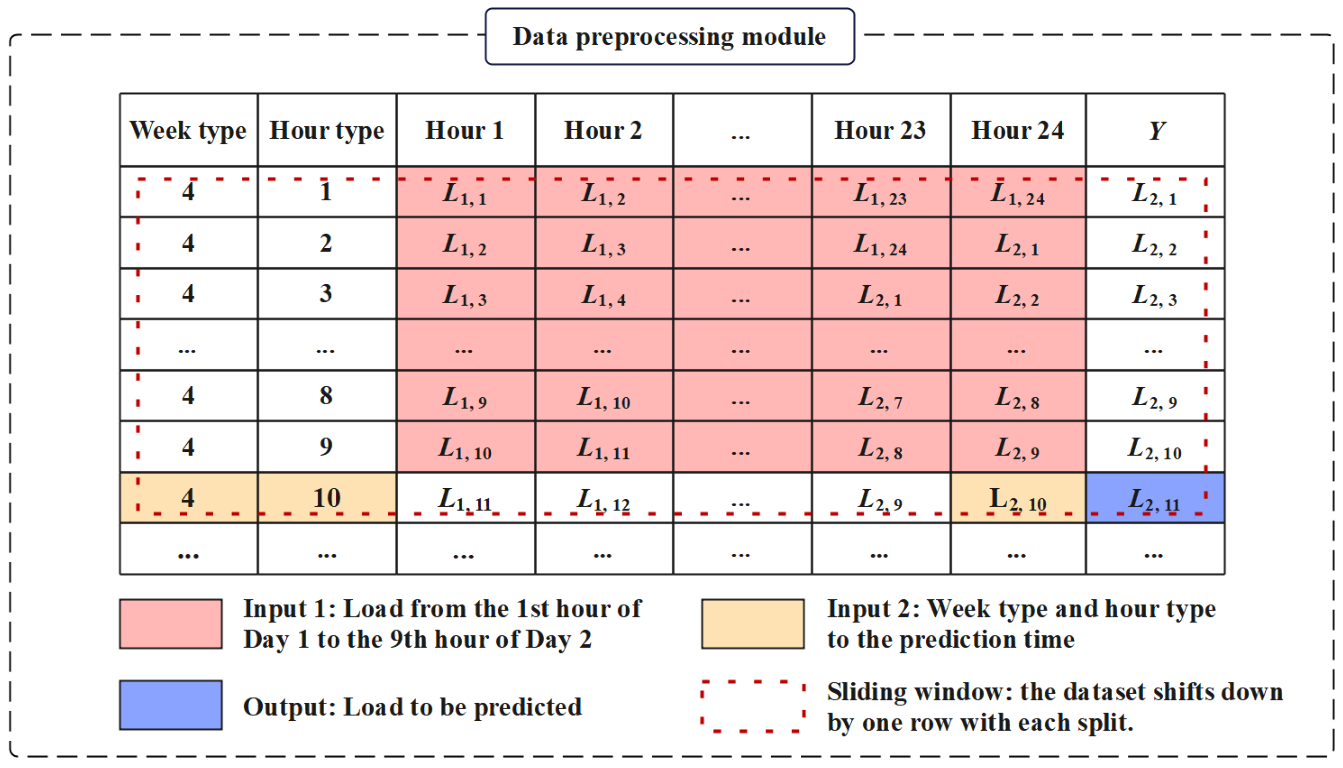 - Data preprocessing: Historical load data is processed using a sliding window method, and temporal information is extracted from it. This step prepares the input and output datasets required for model training and forms the foundation for the training phase.