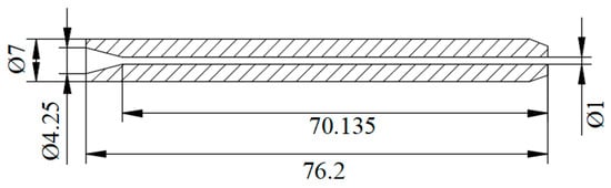 The nozzle is a conventional pre-mixed abrasive-water-jet (AWJ) nozzle for cutting applications, namely a conical–cylindrical nozzle. Its geometric model is shown in Figure 1, with all dimensions in millimeters (mm). The nozzle comprises a conical inlet convergent section and a cylindrical section, with a total length of 76.2 mm. The cylindrical section measures 70.135 mm in length with an internal diameter of 1 mm.
