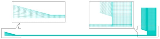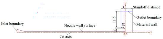 To simulate the flow-field characteristics of a submerged pre-mixed abrasive water jet (SPAWJ) cutting steel plates, pipelines, and other materials, the research domain is defined as the interior flow channel of a conical–cylindrical nozzle and the spatial region extending from the nozzle exit to the material surface. Additionally, considering the axisymmetric nature of the submerged pre-mixed abrasive water jet (SPAWJ) when vertically impinging on a wall, a three-dimensional model is simplified to two-dimensional, and an axisymmetric modeling approach is adopted in order to reduce computational costs. Only half of the cross-sectional domain, symmetric about the nozzle axis, is selected as the computational domain. The geometric model of the computational domain is shown in Figure 2, where the origin (x = 0) corresponds to the nozzle exit cross-section and the positive X-axis aligns with the jet direction. All length dimensions in Figure 2 are given in millimeters (mm), and the magnitude of angle α is 20°. This coordinate system is consistently applied to all data figures except where specifically stated/noted. The mesh generation is performed using ICEM CFD 2022 R2. Due to the simplicity of the geometric model, a structured meshing approach is employed to enhance computational accuracy. Figure 3 illustrates the mesh layout, with local grid refinement applied in the nozzle convergent section, at the nozzle exit, and near the wall regions.