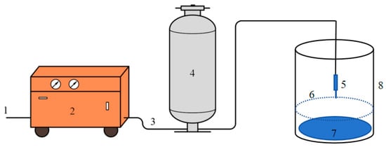 - After charging the abrasive tank with abrasive, initiate the pre-mixed abrasive-water-jet experiment system. Adjust the discharge pressure of the plunger pump in the high-pressure generator to 30 MPa. When the discharge pressure stabilizes, promptly redirect the handheld cutting spray gun into the collection bucket with its nozzle outlet submerged below the water surface to form a submerged pre-mixed abrasive water jet. After sustaining continuous jetting for 3 min, withdraw the gun. Upon cessation of jetting, reweigh the entire assembly and record the final mass as M2. The differential mass (M2 − M1) represents the total weight of the abrasive–water mixture injected into the collection bucket by the pre-mixed abrasive water jet. Dividing this value by time t (where t = 3 min) yields the mass flow rate of the pre-mixed abrasive water jet: (M2 − M1)/t.