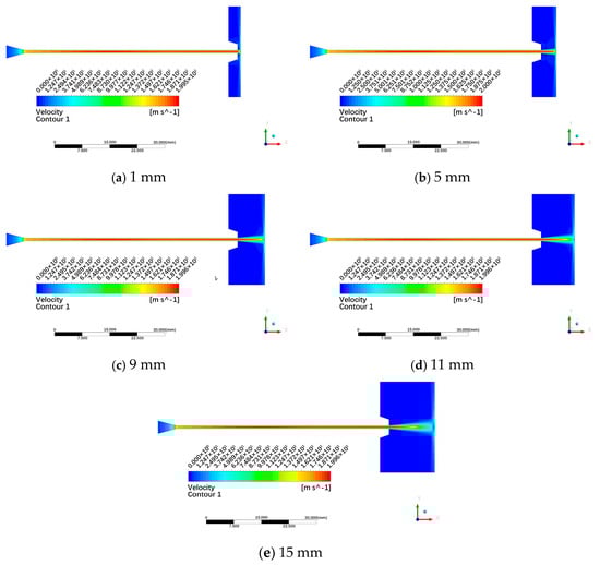 Figure 7 shows the velocity contour plots for different standoff-distance models. As observed in the figure, the velocity increases rapidly in the nozzle convergent section and continues to rise in the nozzle cylinder section. After exiting the nozzle, the velocity decreases sharply within the standoff distance range. In Figure 7a, when the standoff distance is 1 mm, the jet core region is not fully developed, and the jet reaches the wall before full development, then diverges radially. As shown in Figure 7b–e, the pre-mixed abrasive water jet clearly exhibits a distinct jet core region (the red area in the initial jet segment between the nozzle exit and the wall) within the standoff-distance range. For standoff distances of 9 mm, 11 mm, and 15 mm, the jet core region is fully developed. The length of the jet core region remains nearly constant across different standoff distances. Beyond the jet core region, the velocity decreases rapidly, and the entire jet spreads into a conical shape. Additionally, as seen in Figure 7, a “water cushion layer” with a definite thickness and a comparatively low jet velocity develops adjacent to the wall when the jet impinges on the wall. When the jet impinges into the water cushion, it undergoes intense friction with the relatively low-speed water body, thereby dissipating and dispersing its enormous kinetic energy. This is detrimental to the erosive action of abrasive particles on the target material. It can be anticipated that, when using a submerged pre-mixed abrasive water jet (SPAWJ) to cut submarine pipelines, the vertical jet is not conducive to the rapid dispersion of water and abrasive particles after the cut is formed. Tilting the nozzle appropriately facilitates the rapid dispersion of water and abrasive particles, which is beneficial for cutting.