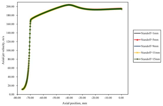 Figure 8 shows the variation curves of axial-jet velocity along the centerline within nozzles for different standoff-distance models. As observed in Figure 8, the axial-jet velocity increases rapidly in the convergent section of the nozzle, continues to accelerate over a certain distance after entering the cylindrical section, reaches its maximum value inside the nozzle, and then decelerates to a steady value before exiting the nozzle. The axial-jet-velocity variation trends along the nozzle centerline exhibit high similarity, namely nearly overlapping for different standoff-distance models. This indicates that external environmental factors—that is to say, the standoff distances—have a minimal impact on the internal flow field.