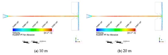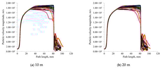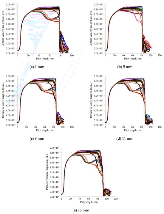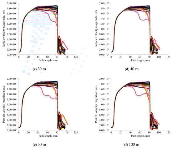 Figure 19 presents the particle velocity versus trajectory length curves under different submergence depths. As observed in the figure, the particle velocity profiles at different submergence depths match those in Figure 13b for a 5 mm standoff distance. Namely, the acceleration characteristics of abrasive particles are generally favorable, with only a small fraction of abrasive particles decelerating significantly before reaching either the target wall or nozzle exit. Most particles maintain high velocities from the nozzle exit to the target wall, which enhances the cutting effectiveness of submerged pre-mixed abrasive water jets. In other words, the submergence depth has minimal impact on the velocity variation characteristics of abrasive particles.