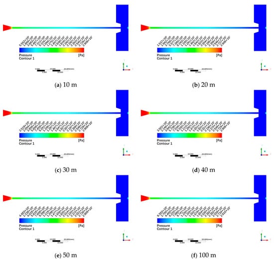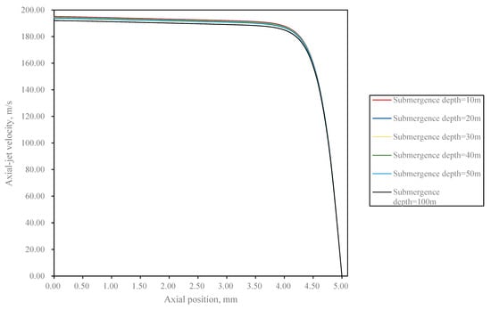 Figure 16 illustrates the pressure contour plots under different submergence depths. The pressure distributions across different submergence depths show remarkable similarity, with no significant distinctions observed. Notably, the jet pressure profile exhibits an identical pattern to that documented in Figure 10 for different standoff-distance models. Jet pressure peaks at the nozzle inlet and decreases progressively along the jet direction within the nozzle. Upon exiting the nozzle, the jet pressure approaches ambient levels. When impinging on the wall surface, rapid decay of axial-jet velocity generates significant stagnation pressure. Figure 17 illustrates the variation curve of pressure along the centerline under different submergence depths. These curves exhibit striking similarity: near the nozzle exit, pressure approaches ambient levels (at submergence depths of 10 m, 20 m, 30 m, 40 m, 50 m, and 100 m, the jet pressure at x = 0 mm on the axis was 0.180049 MPa, 0.2778473 MPa, 0.375646 MPa, 0.473447 MPa, 0.571254 MPa, and 1.060258 MPa, respectively), while stagnation pressure magnitudes adjacent to the wall remain similar across all submerged conditions (at submergence depths of 10 m, 20 m, 30 m, 40 m, 50 m, and 100 m, the jet pressure at x = 5 mm on the axis was 18.513368 MPa, 18.548792 MPa, 18.584218 MPa, 18.619646 MPa, 18.655084 MPa, and 18.832352 MPa, respectively). That is, the stagnation pressure increases slightly with greater submergence depth. However, the variation patterns of jet pressure remain similar across different depths.