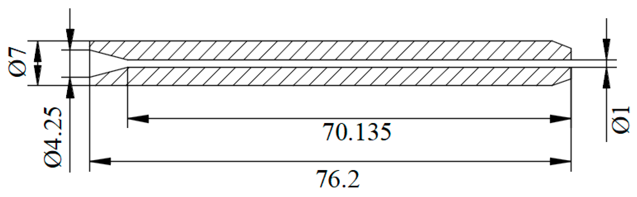 The nozzle is a conventional pre-mixed abrasive-water-jet (AWJ) nozzle for cutting applications, namely a conical–cylindrical nozzle. Its geometric model is shown in Figure 1, with all dimensions in millimeters (mm). The nozzle comprises a conical inlet convergent section and a cylindrical section, with a total length of 76.2 mm. The cylindrical section measures 70.135 mm in length with an internal diameter of 1 mm.