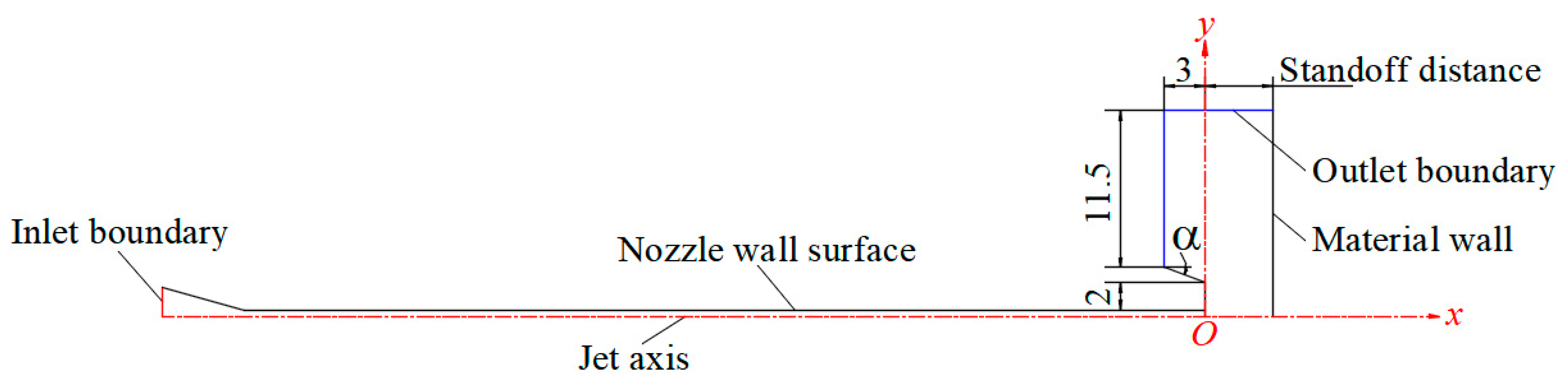 19. Wang, C.; Shen, Y.; Liu, Z.; Zhao, Y.; Zhu, Y. Numerical simulation of straight cone nozzle abrasive water jets submerged. J. Daqing Pet. Inst. 2011, 35, 51–54. [Google Scholar] [CrossRef]