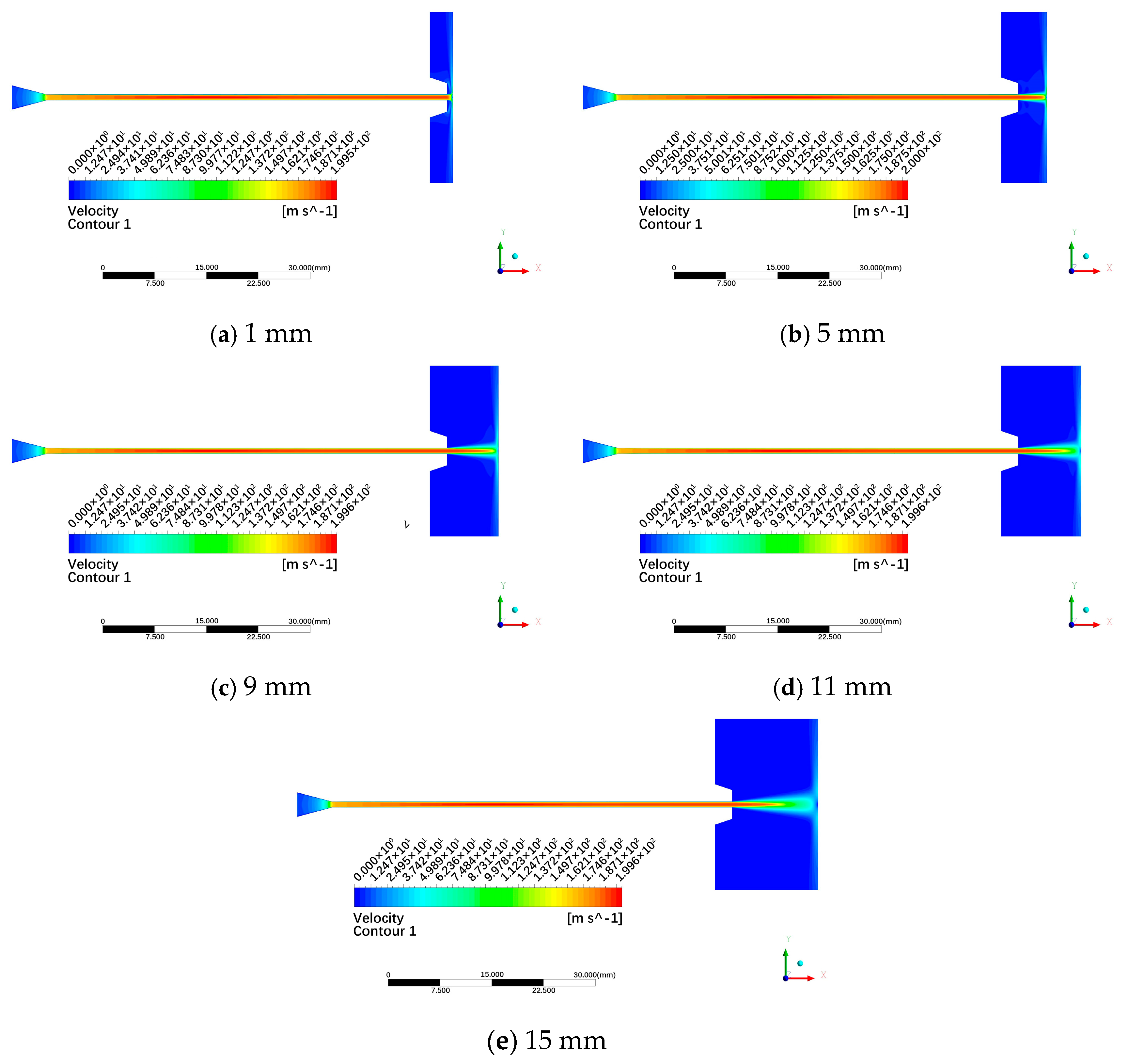The submergence depth of the pre-mixed abrasive-water-jet cutting is maintained at 30 cm, corresponding to a constant pressure of 2941.98 Pa (equivalent to a 30 cm water column) at the pressure outlet boundary. The standoff distances are varied as 1 mm, 5 mm, 9 mm, 11 mm, and 15 mm, and different computational domain models are constructed for numerical simulation. In all models, the jet direction is perpendicular to the target wall.