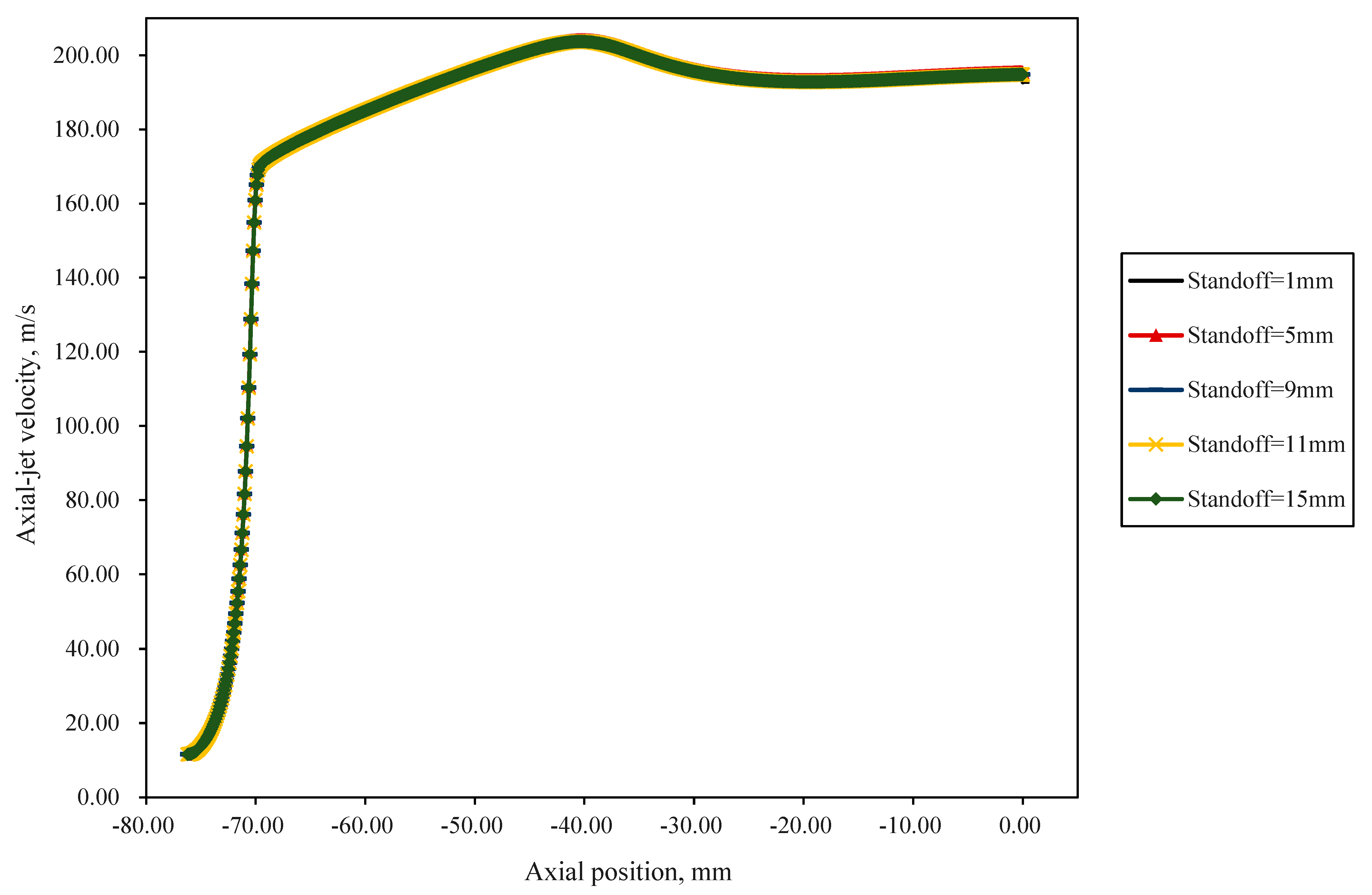 The axial-jet velocity increases rapidly in the convergent section of the nozzle, continues to accelerate over a certain distance after entering the cylindrical section, reaches its maximum value inside the nozzle, and then decelerates to a steady value before exiting the nozzle. In addition, the standoff distance has minimal impact on the flow-field characteristic inside the nozzle.