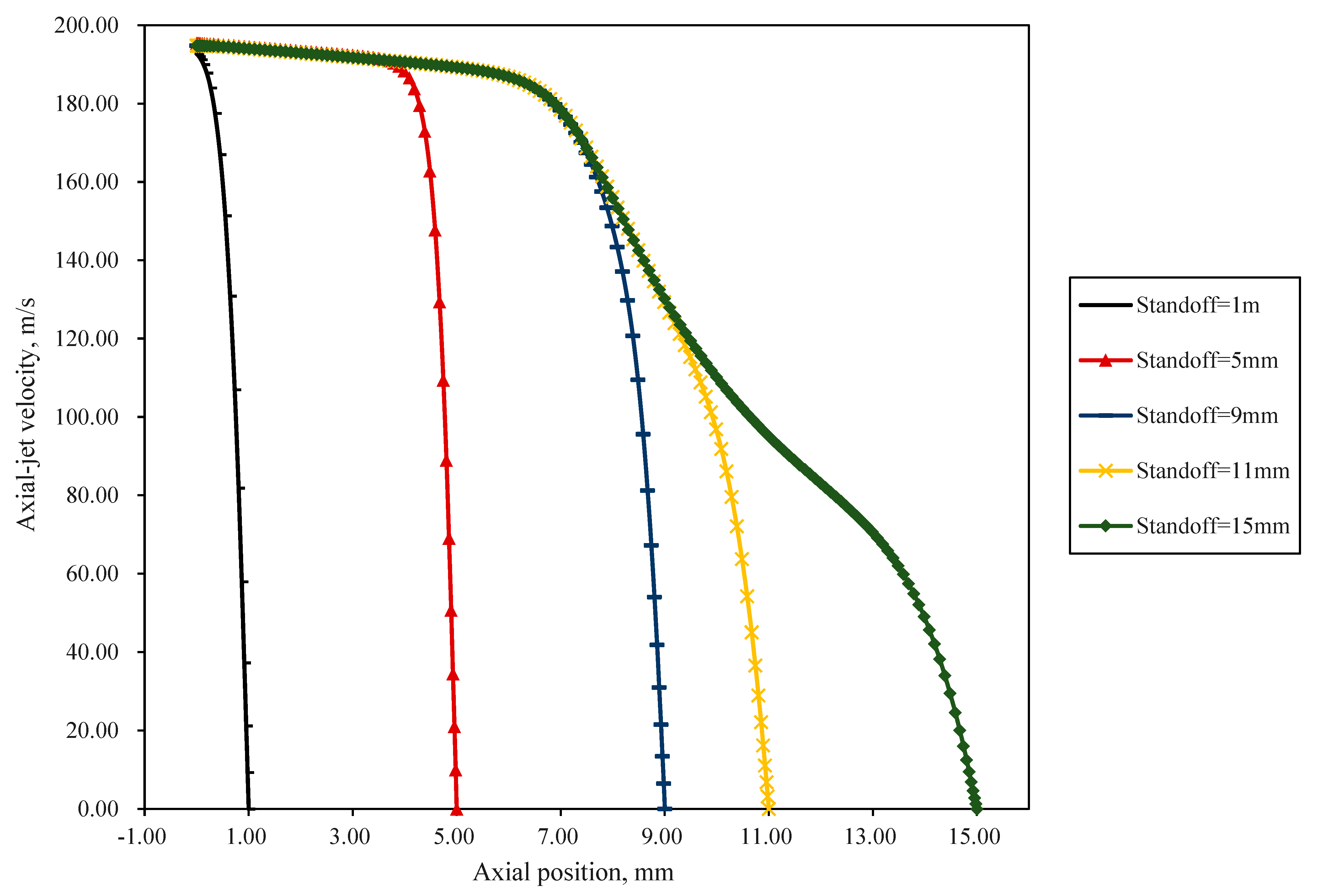 4.4.1. Influence of Standoff Distance on the Flow-Field Characteristics of the Submerged Pre-Mixed Abrasive Water Jet