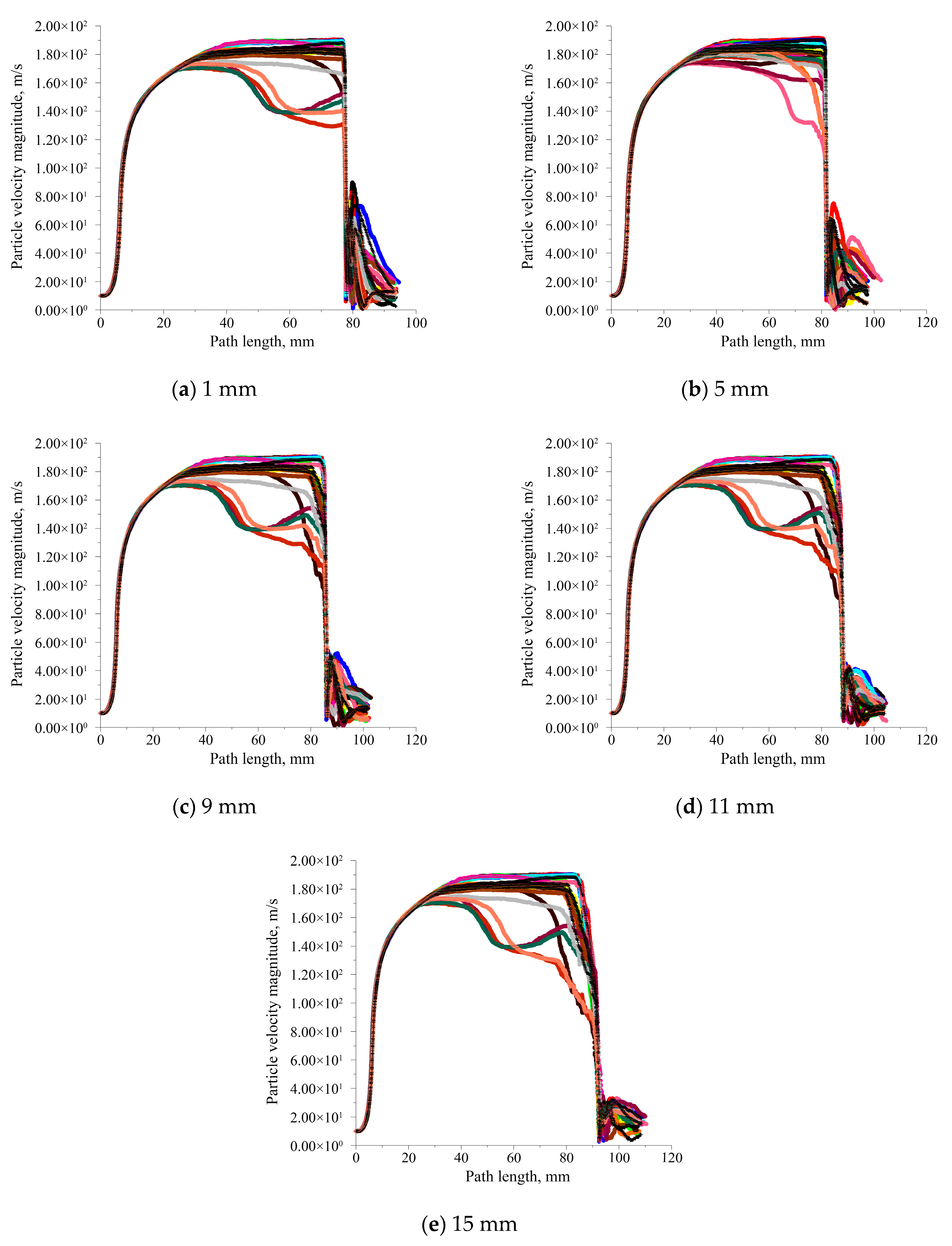 Figure 13 presents the particle velocity versus trajectory length curves for different standoff-distance models. Each plot displays 20 randomly selected particle velocity profiles represented in 20 different colors, with the abscissa representing the traveled trajectory length and the ordinate indicating particle velocity magnitude. Abrupt velocity changes correspond to wall impact locations. Beyond the end of the curves indicates that abrasive particles have escaped from the computational domain; these are identical in the subsequent particle trajectory plots. As observed in the figure, compared to the case with a standoff distance of 5 mm, significant deceleration is observed for more particles before they reach either the target wall or nozzle exit at standoff distances of 1 mm, 9 mm, 11 mm, and 15 mm. Namely, overall acceleration of abrasive particles is optimal at a 5 mm standoff distance. Thus, considering the effects of standoff distance on jet velocity and abrasive particle dynamics, a standoff distance of 5 mm is determined to be optimal for submerged pre-mixed abrasive-water-jet (SPAWJ) pipe-cutting operations.
