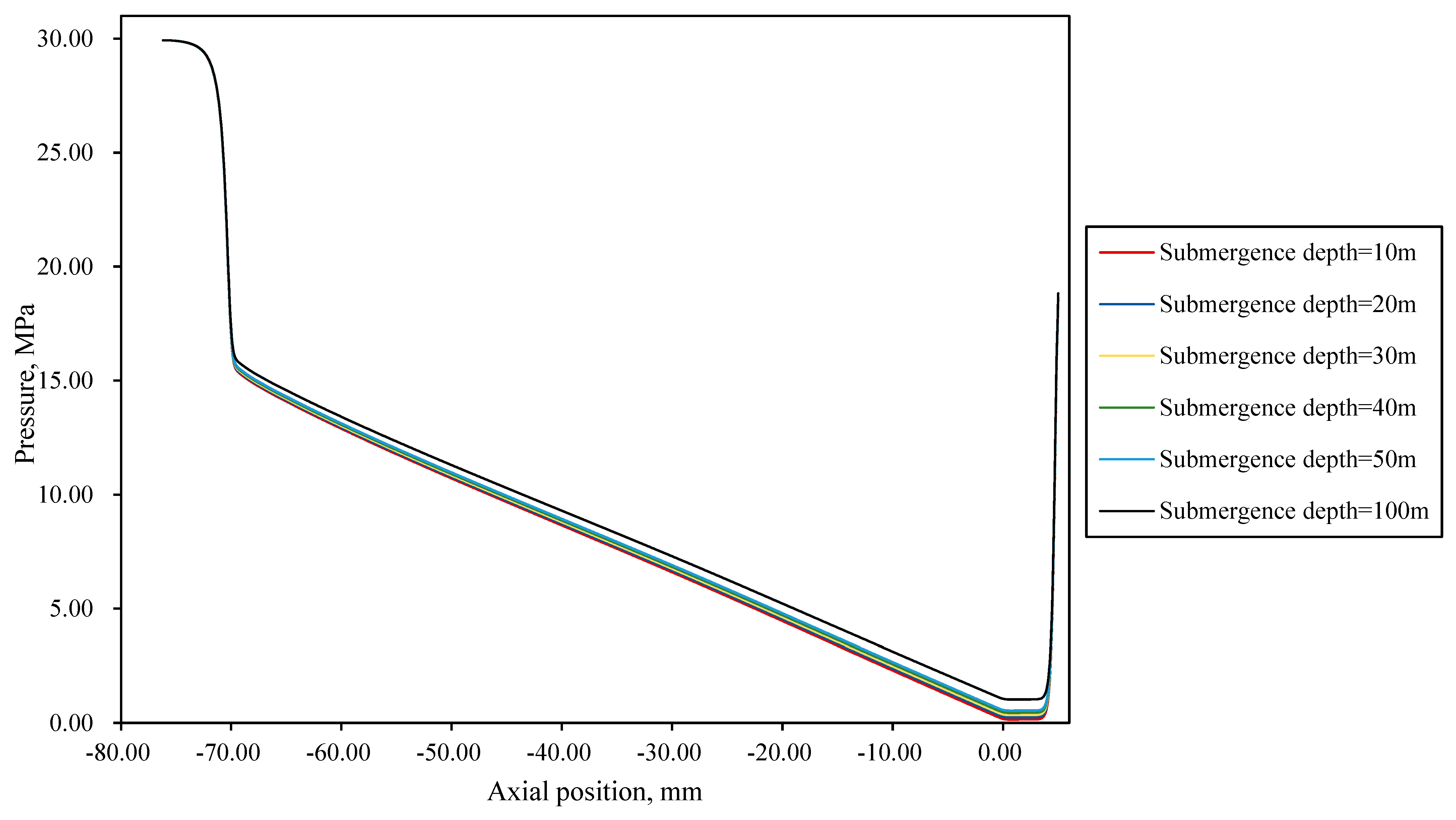Figure 16 illustrates the pressure contour plots under different submergence depths. The pressure distributions across different submergence depths show remarkable similarity, with no significant distinctions observed. Notably, the jet pressure profile exhibits an identical pattern to that documented in Figure 10 for different standoff-distance models. Jet pressure peaks at the nozzle inlet and decreases progressively along the jet direction within the nozzle. Upon exiting the nozzle, the jet pressure approaches ambient levels. When impinging on the wall surface, rapid decay of axial-jet velocity generates significant stagnation pressure. Figure 17 illustrates the variation curve of pressure along the centerline under different submergence depths. These curves exhibit striking similarity: near the nozzle exit, pressure approaches ambient levels (at submergence depths of 10 m, 20 m, 30 m, 40 m, 50 m, and 100 m, the jet pressure at x = 0 mm on the axis was 0.180049 MPa, 0.2778473 MPa, 0.375646 MPa, 0.473447 MPa, 0.571254 MPa, and 1.060258 MPa, respectively), while stagnation pressure magnitudes adjacent to the wall remain similar across all submerged conditions (at submergence depths of 10 m, 20 m, 30 m, 40 m, 50 m, and 100 m, the jet pressure at x = 5 mm on the axis was 18.513368 MPa, 18.548792 MPa, 18.584218 MPa, 18.619646 MPa, 18.655084 MPa, and 18.832352 MPa, respectively). That is, the stagnation pressure increases slightly with greater submergence depth. However, the variation patterns of jet pressure remain similar across different depths.