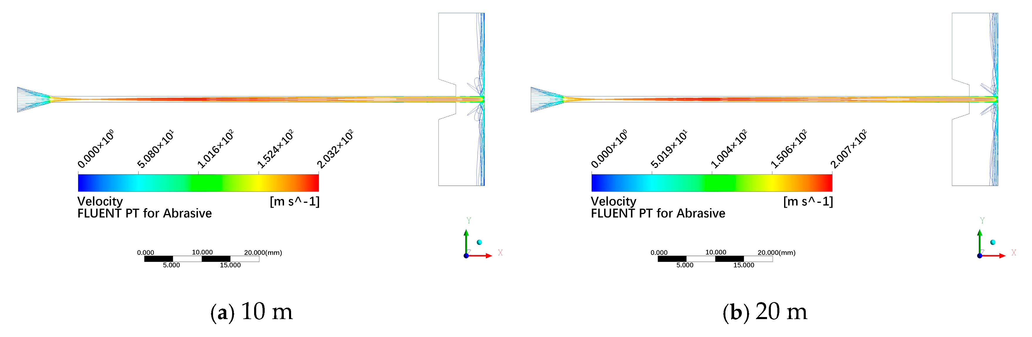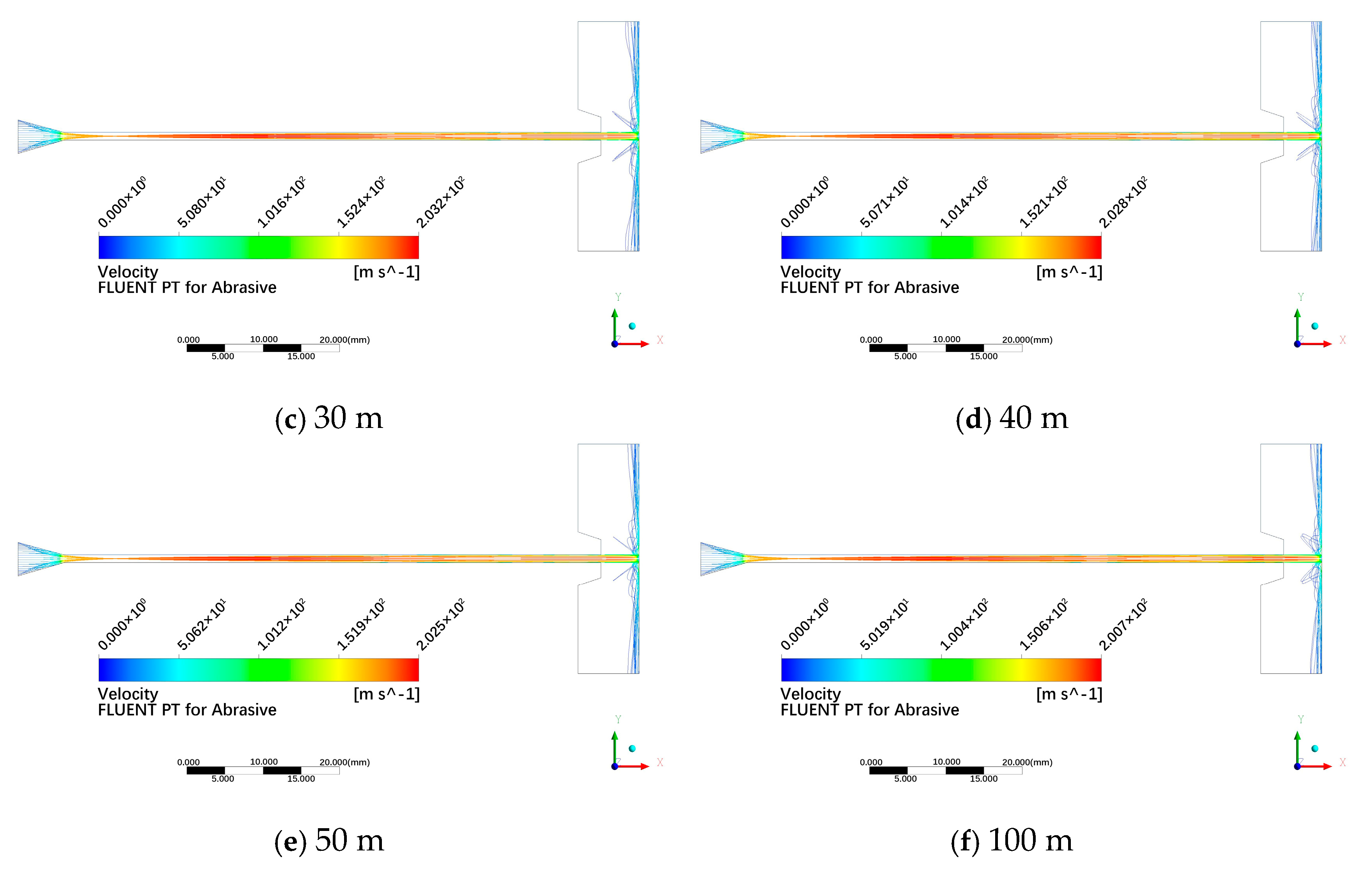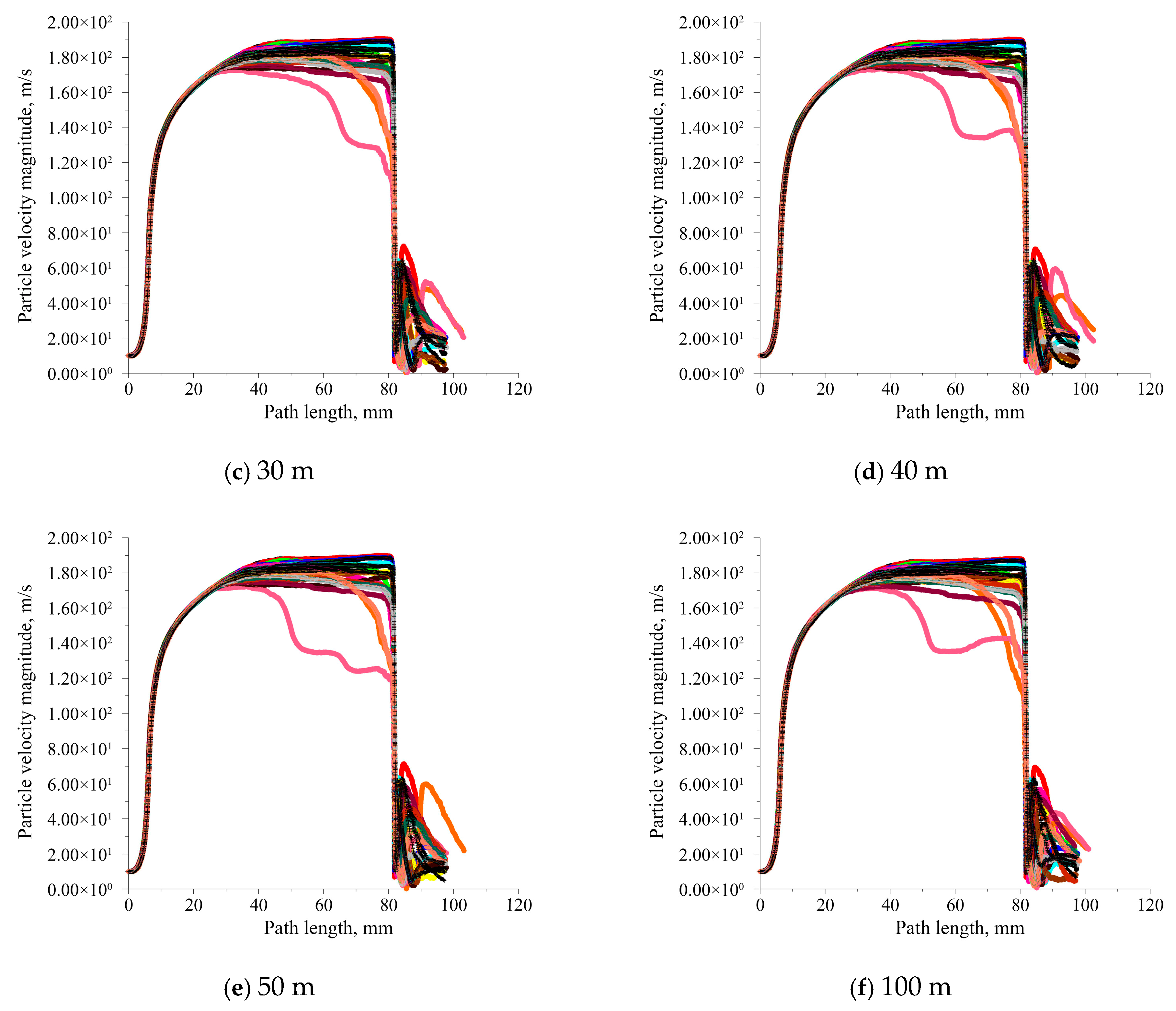 Figure 19 presents the particle velocity versus trajectory length curves under different submergence depths. As observed in the figure, the particle velocity profiles at different submergence depths match those in Figure 13b for a 5 mm standoff distance. Namely, the acceleration characteristics of abrasive particles are generally favorable, with only a small fraction of abrasive particles decelerating significantly before reaching either the target wall or nozzle exit. Most particles maintain high velocities from the nozzle exit to the target wall, which enhances the cutting effectiveness of submerged pre-mixed abrasive water jets. In other words, the submergence depth has minimal impact on the velocity variation characteristics of abrasive particles.