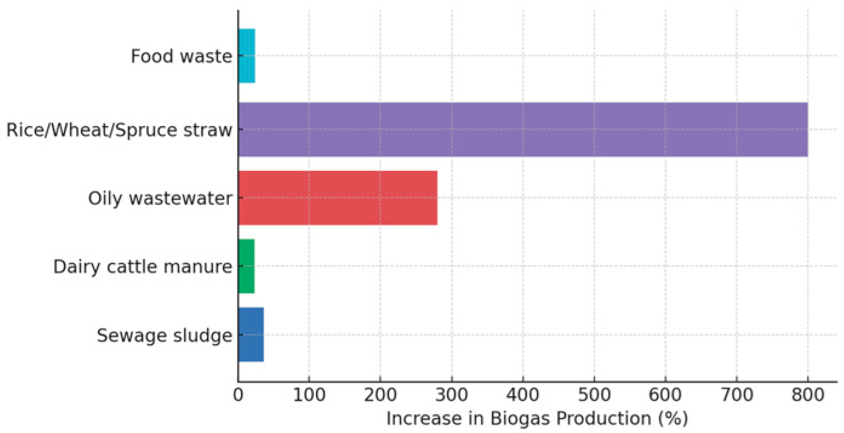 | Biochar | Brewer’s spent grain | Biochar (BC300, BC450, BC600) | +1.8% to +10% (Biochar share 2–50%) | Mesophilic (37 °C), 30 days, SIR 0.5–2.0 | DIET facilitation, buffering, adsorption of inhibitors |