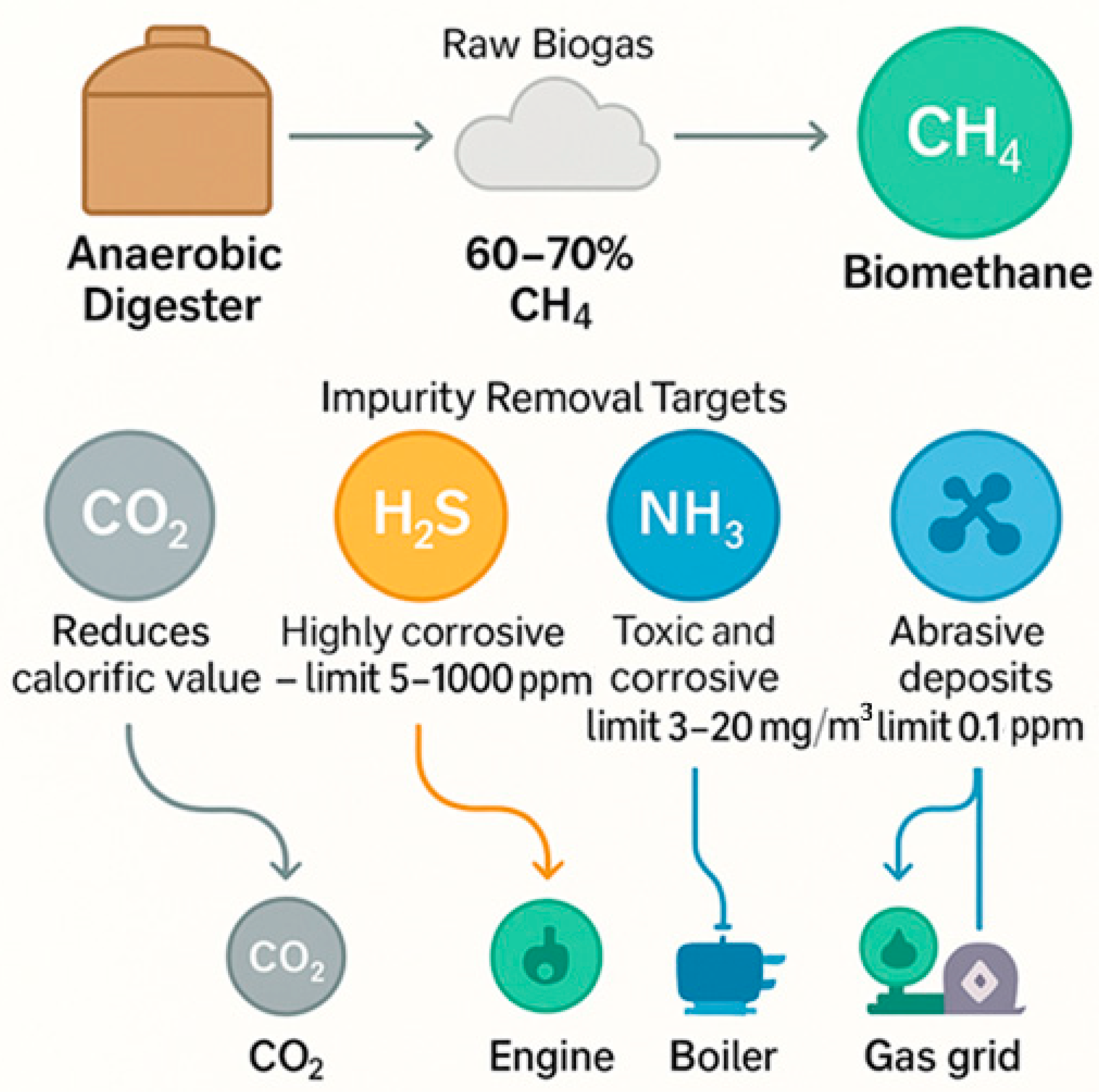 | Physical and chemical upgrading | Membrane separation Cryogenic separation Adsorption (sorbents, solvents, ionic liquids) | Physical and chemical removal of CO2, H2S, NH3, and siloxanes. Ionic liquids-based systems reduce energy demand from 0.785 to 0.211 kWh/Nm3 and exhibit autothermal potential | High CH4 purity (>97%) Technological maturity Scalable for industrial plants | High capital and operating costs CH4 loss during separation Susceptibility to impurities | [51,52] |