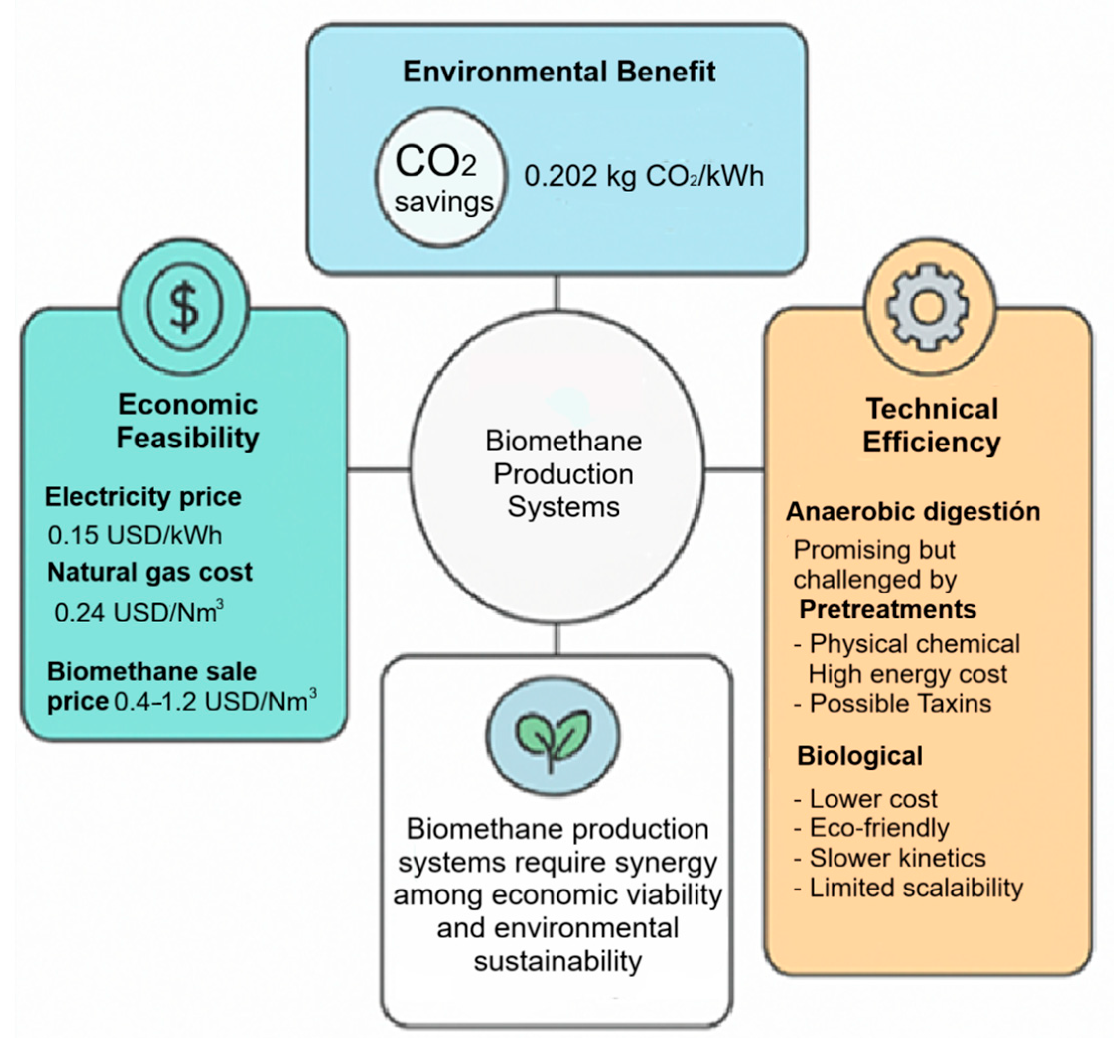| Bio-photosynthetic Routes | Microalgae-assisted upgrading Photobioreactors | Photosynthetic CO2 fixation and O2 production by microalgae; reduces CO2 to 2–6% in raw biogas while generating biomass. | CO2 mitigation + biomass recovery Integrates wastewater treatment | Requires light supply and control Lower productivity in large-scale systems | [53,54,61] |