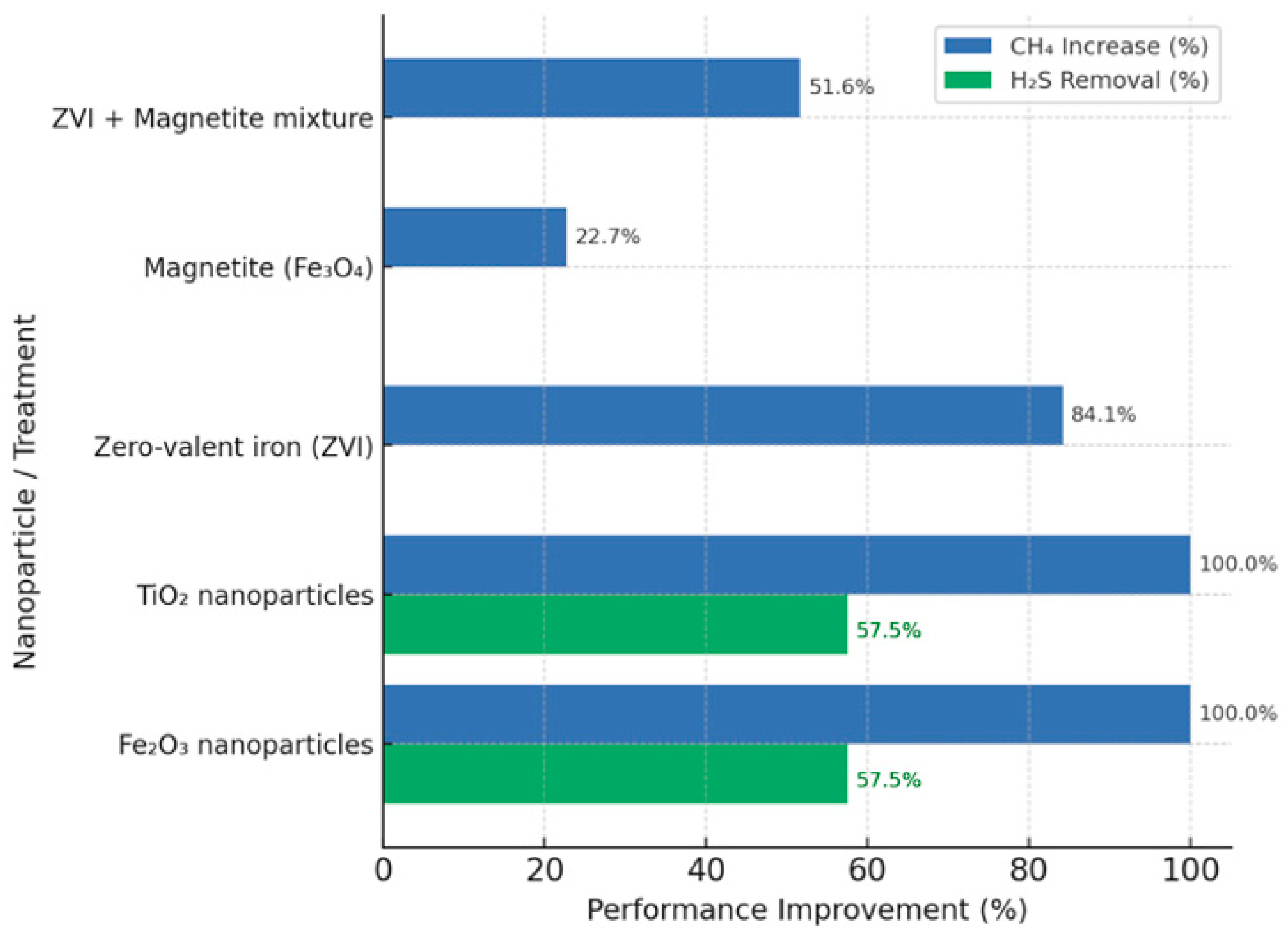 | Carbon Nanotubes | Municipal solid waste sludge | Multi-walled (550 mg/kg to 6 g/L) | 35–55% | Mesophilic, batch | DIET, conductive network for syntrophic bacteria |