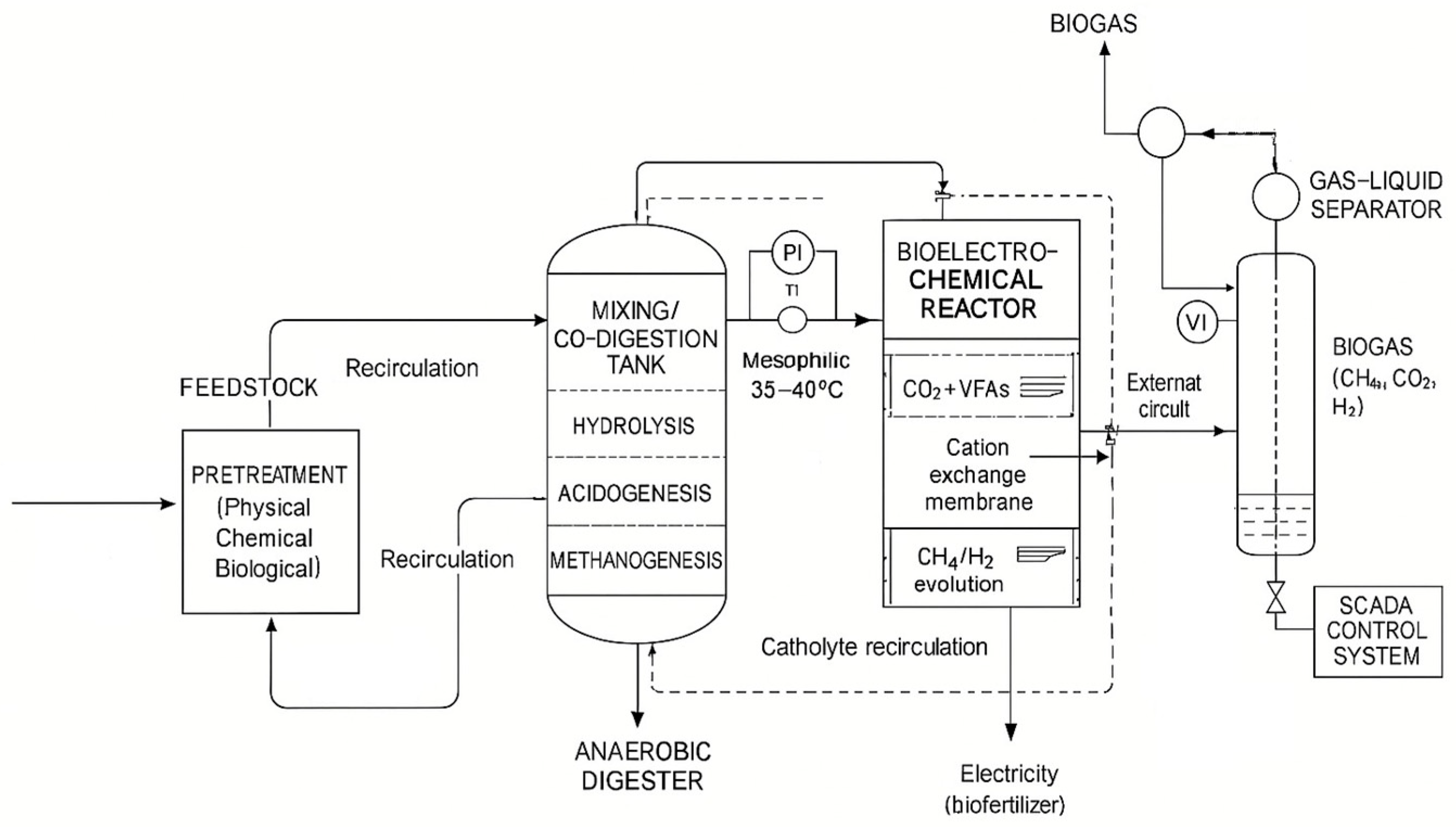 | AD-MEC | Waste Activated Sludge | - | 97.8 mL CH4/g vs. added | 85.9% | 0.7 V T 55 °C HRT 14 days | Electromethanogenesis, microbial enrichment |