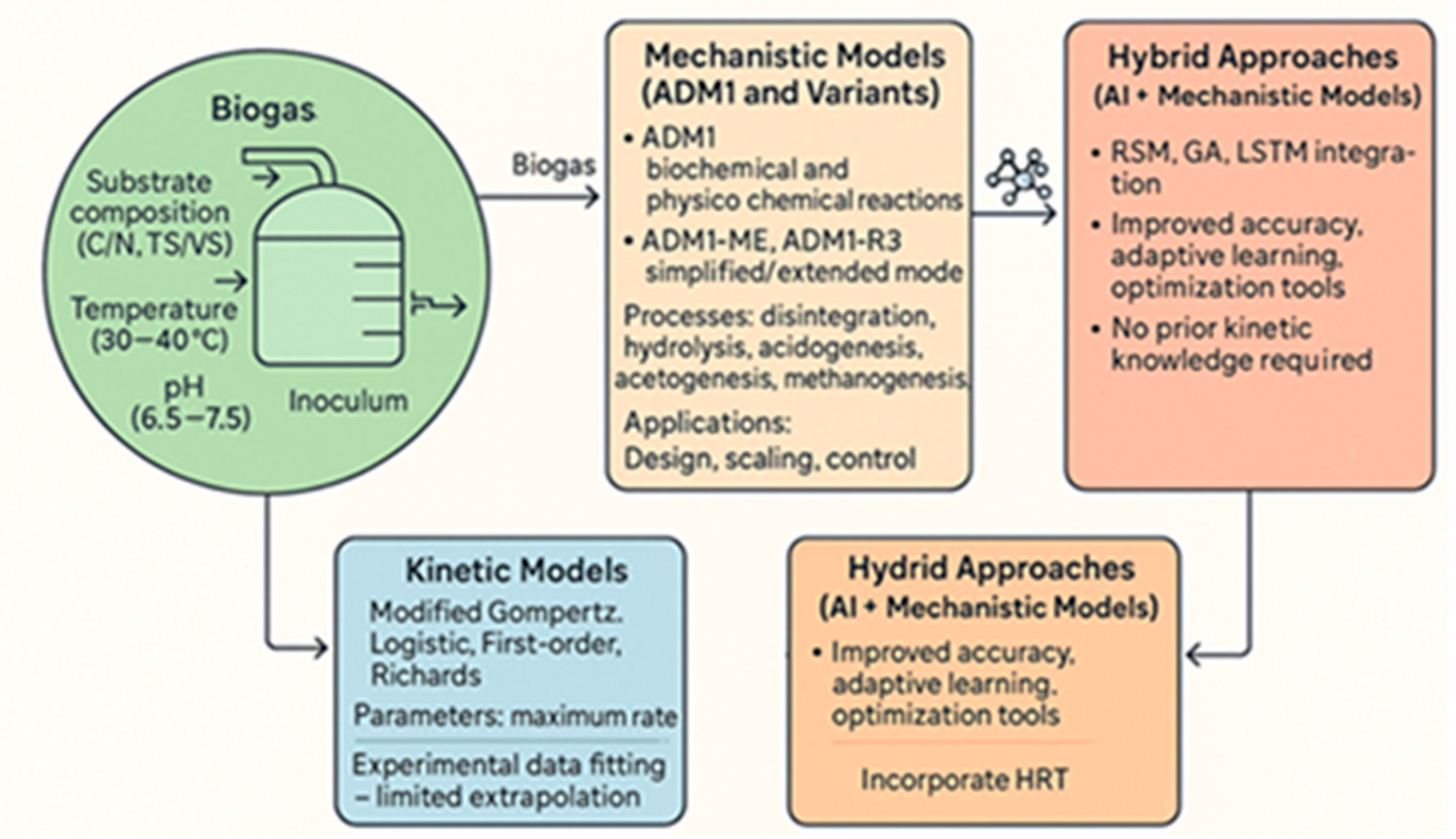 | Gompertz | Max production rate, lag phase, max yield | Time-series biogas/methane yield | R2 ≈ 0.93–0.98 |