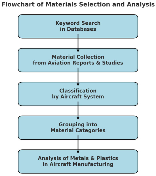 The selection process prioritized sources that extensively addressed the materials used in aircraft systems, including equipment, cabin interiors, airframes, landing gear, and hydraulic systems. Given the complexity of aircraft structures and the variability in material composition across different aircraft models, the collected data were categorized into clusters based on material type. The primary focus was on metals and plastics, as these represent the dominant materials in aircraft manufacturing.