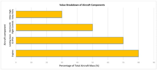 Moving forward with more energy-intensive production of aircraft components, engines are essential to examine. Aircraft engines represent 80% of the total residual value, heavily influencing all aircraft disassembly decisions. Landing gears, Auxiliary Power Units (APUs), electrical power systems, flight controls, and navigation systems are among the top five high-value components, constituting around 70% of the airframe’s value, excluding the aircraft engines (see Figure 2). Other valuable parts include engine control systems, environmental control systems, hydraulic systems, safety equipment, pumps, electric motors, escape slides, flap tracks, and all flight control systems from ailerons and elevators to thrust reversers and horizontal stabilizers [15]. However, the level of recycling in engines remains low, and a vast amount of the materials end up in landfills. Enabling direct recycling of aircraft engines would significantly enhance the materials’ value and could potentially reduce the need for raw materials usage [14].